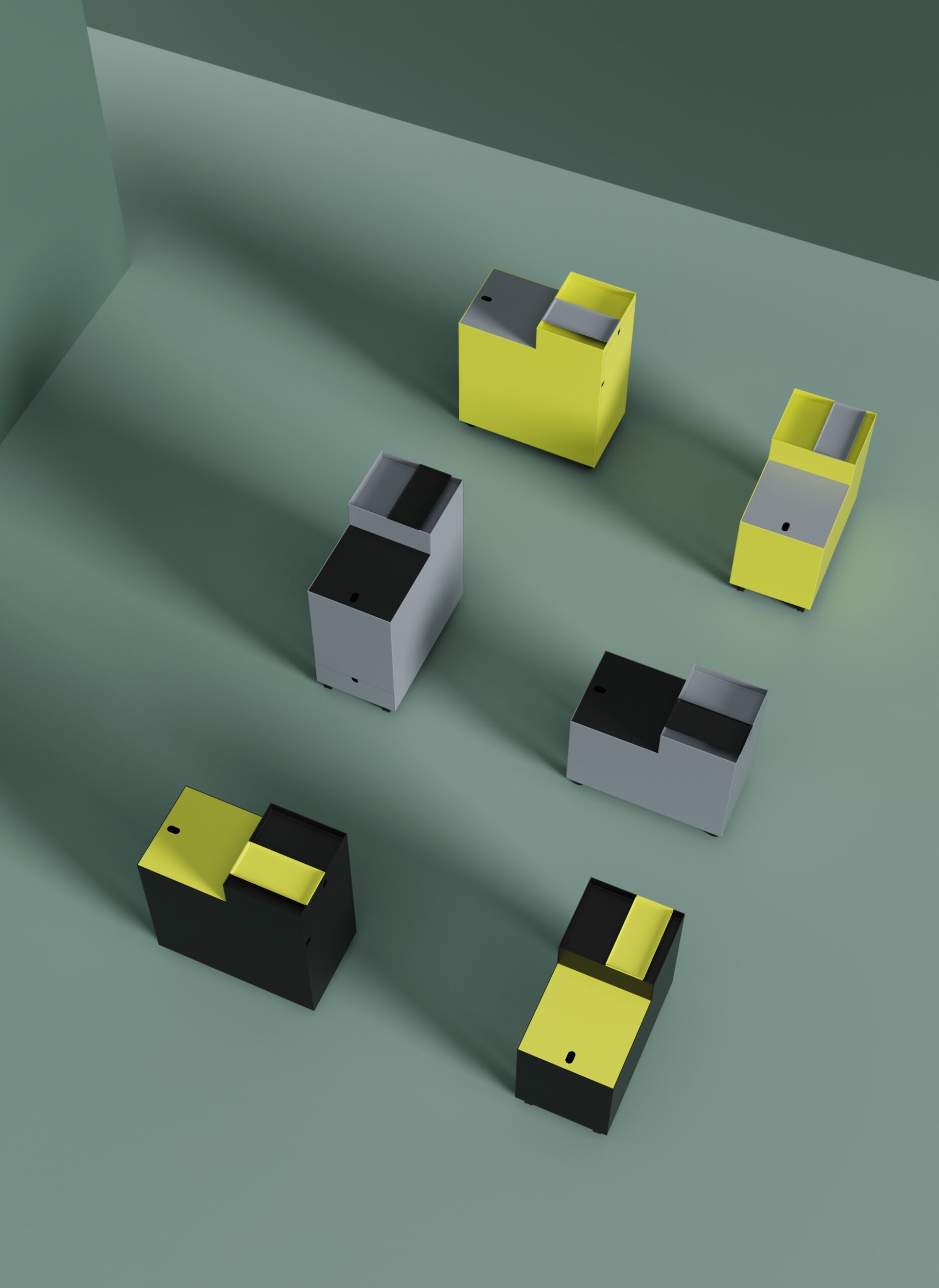 - Rollcontainer mit Sitzfunktion: abgestufte Form ermöglicht kurzes Sitzen bei Projekt- oder Teamarbeit.