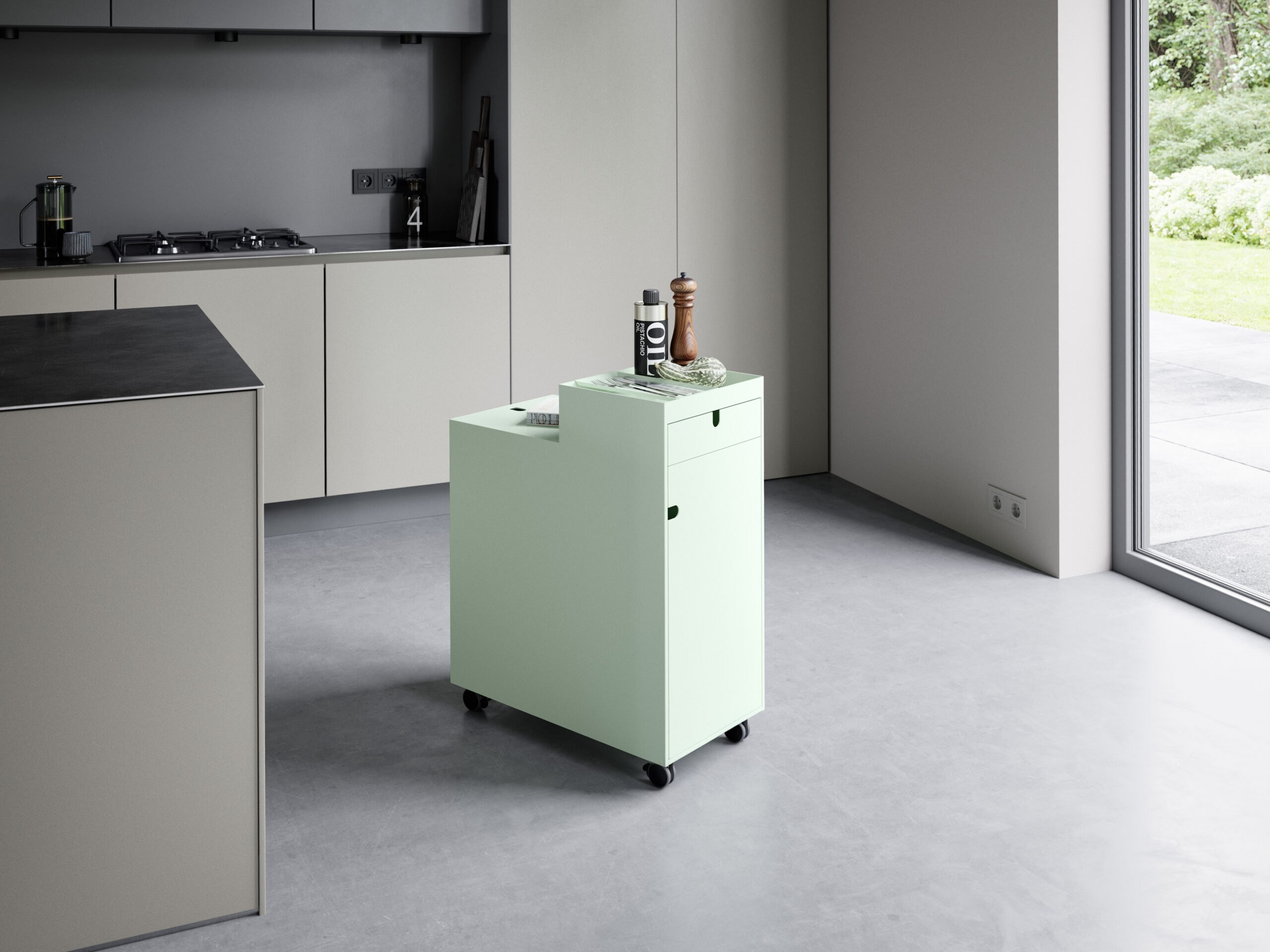 - Mehr Volumen, zusätzliche Ablagefläche und ergonomische Höhe als Beistellwagen.