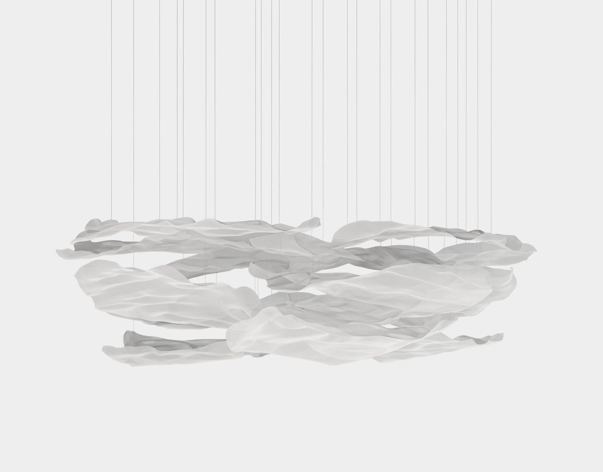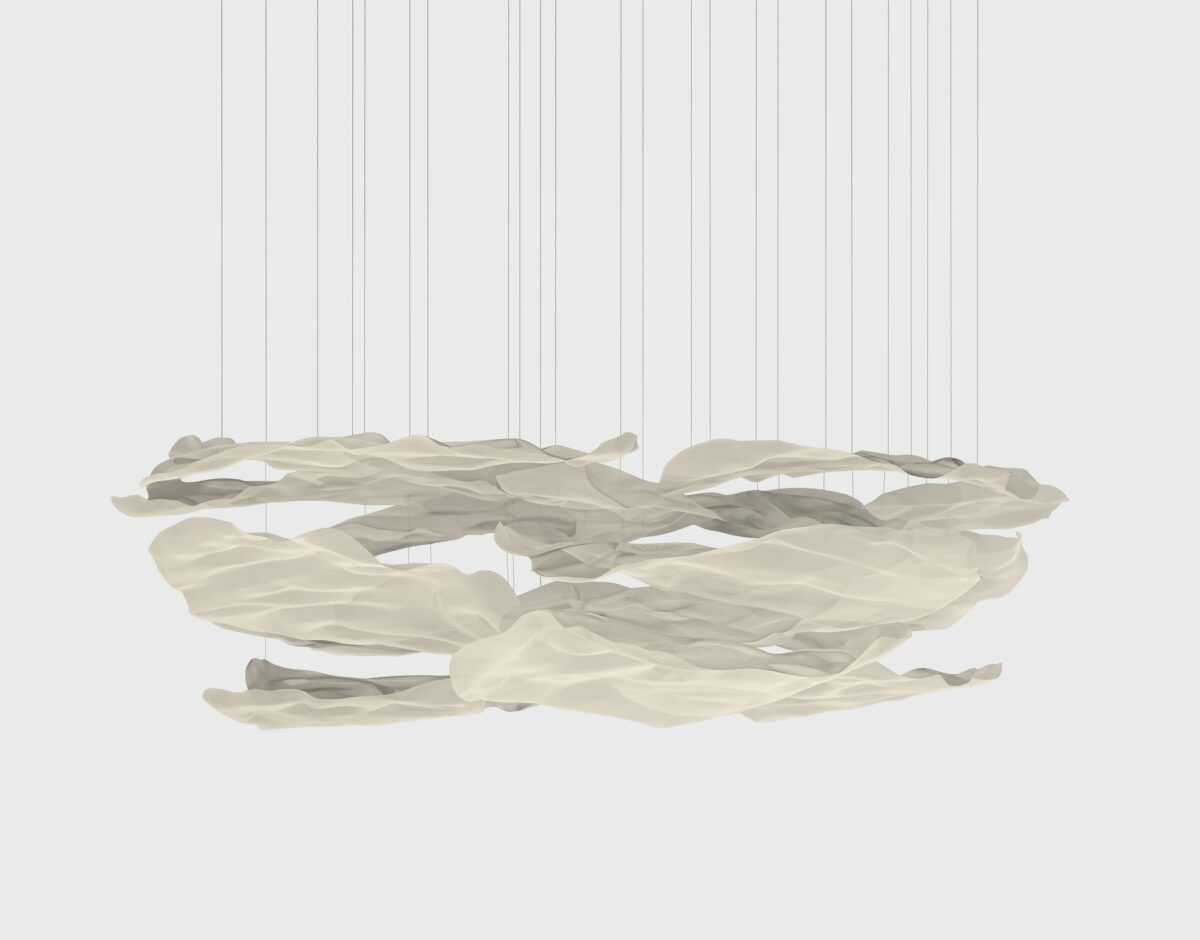 Der Name “Brétema” bedeutet atlantischer Nebel. Diese Pendelleuchte interpretiert Wolkenformationen als modernes Lichtdesign neu. Verschiedene Schichten überlagern sich harmonisch und werden von LED-Licht sanft durchflutet.