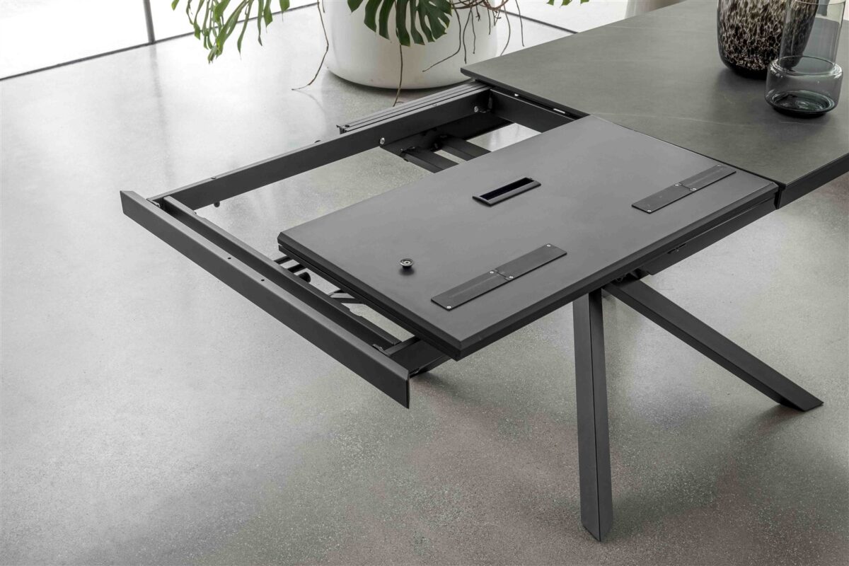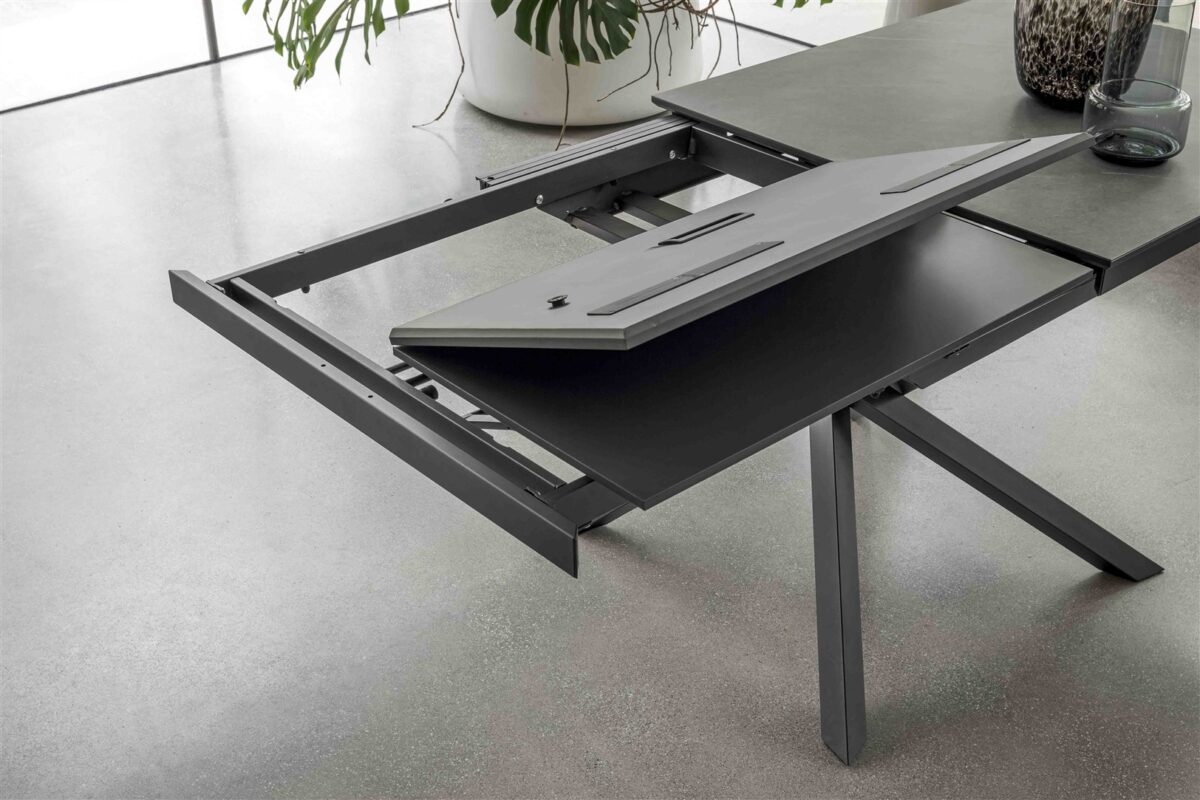 Bei der Laminat-Ausführung ist die Verlängerungsplatte farblich identisch zur Hauptplatte. Bei Keramik-Tischplatten wird die Verlängerung farblich harmonisch abgestimmt, was ein durchgängig stimmiges Erscheinungsbild garantiert.