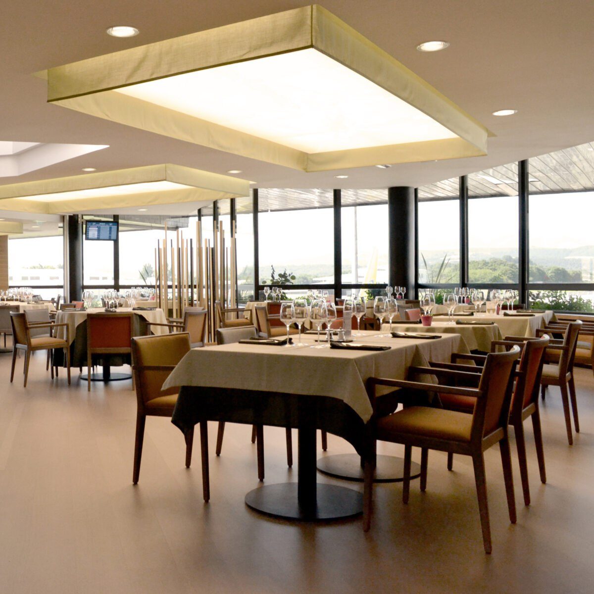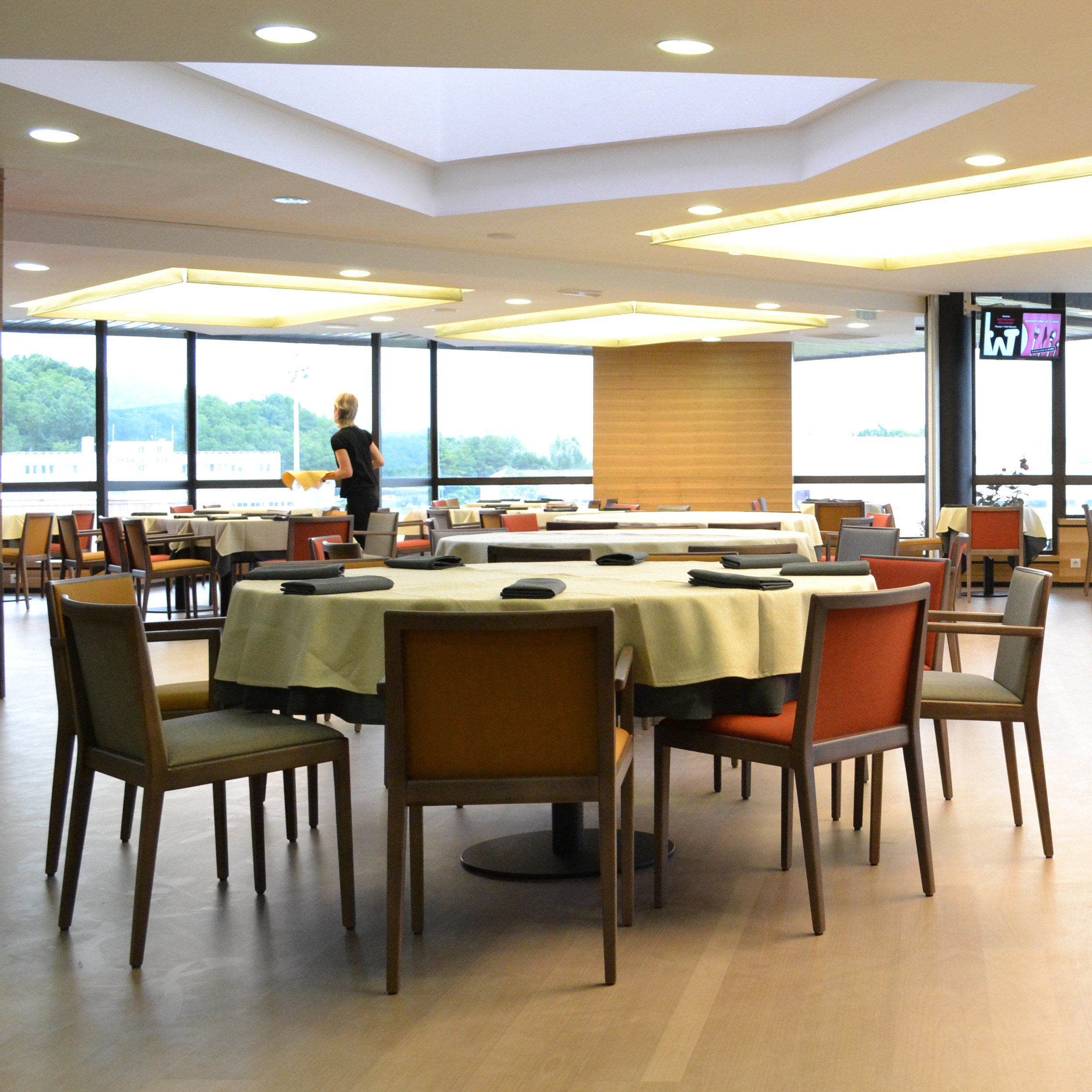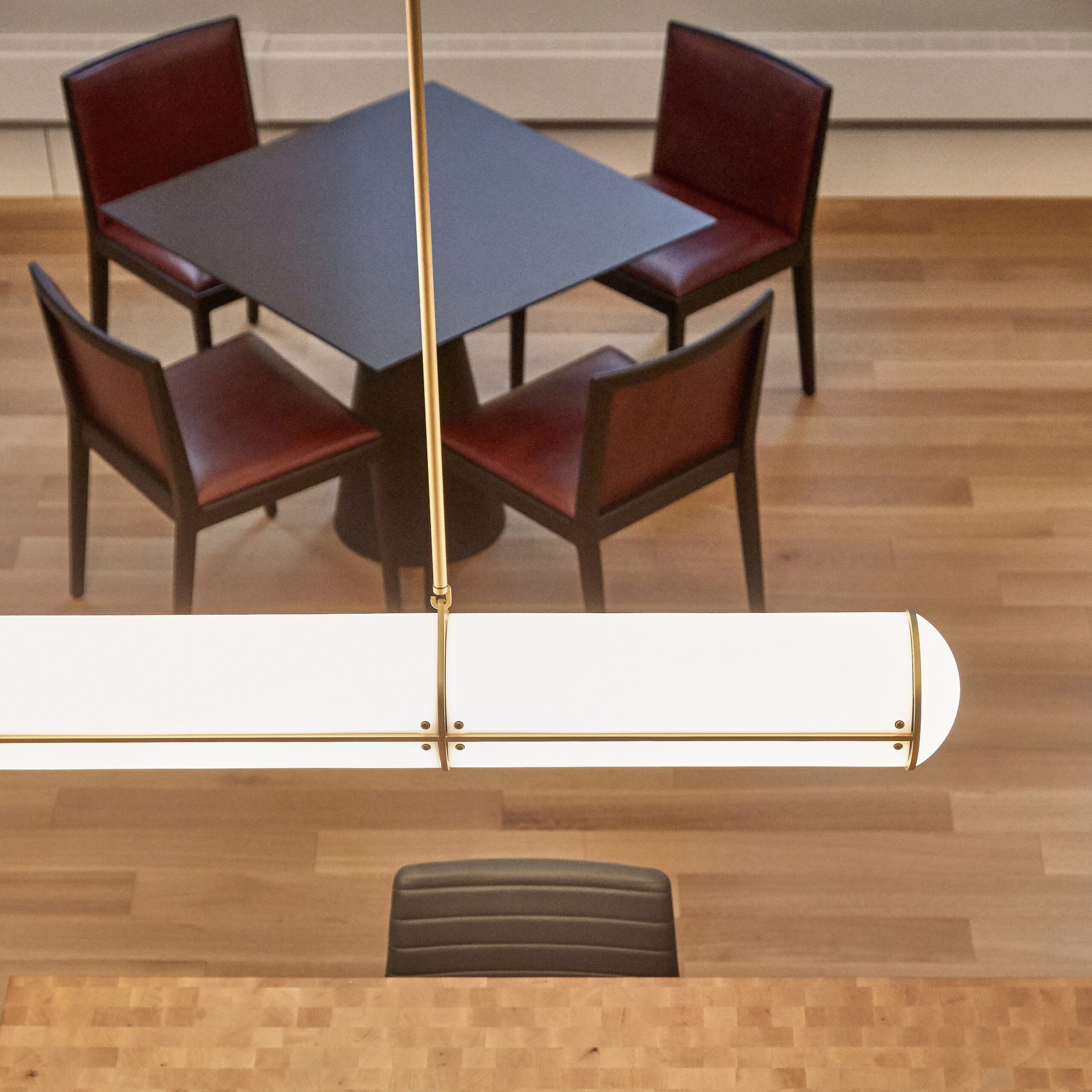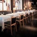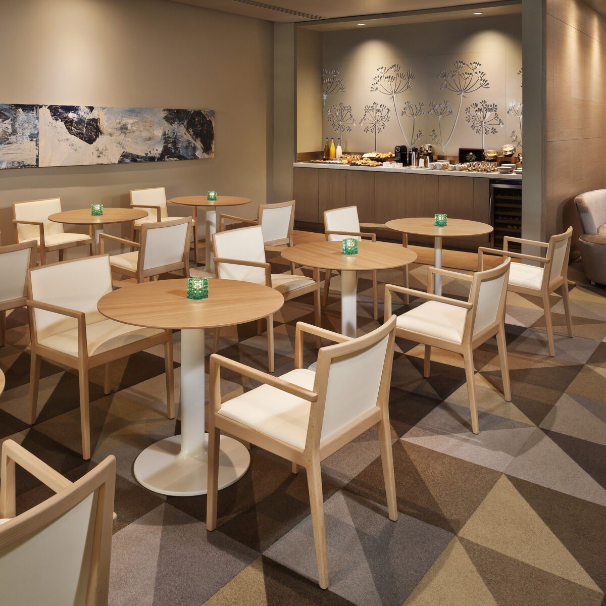 - Hospitality Look: mehrere Designstühle im Ensemble, ruhige Farbpalette, solide Tischplatten.