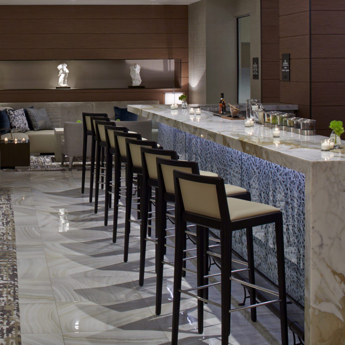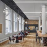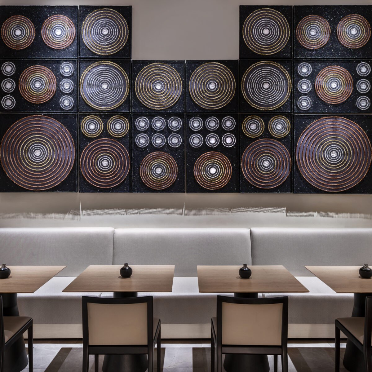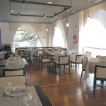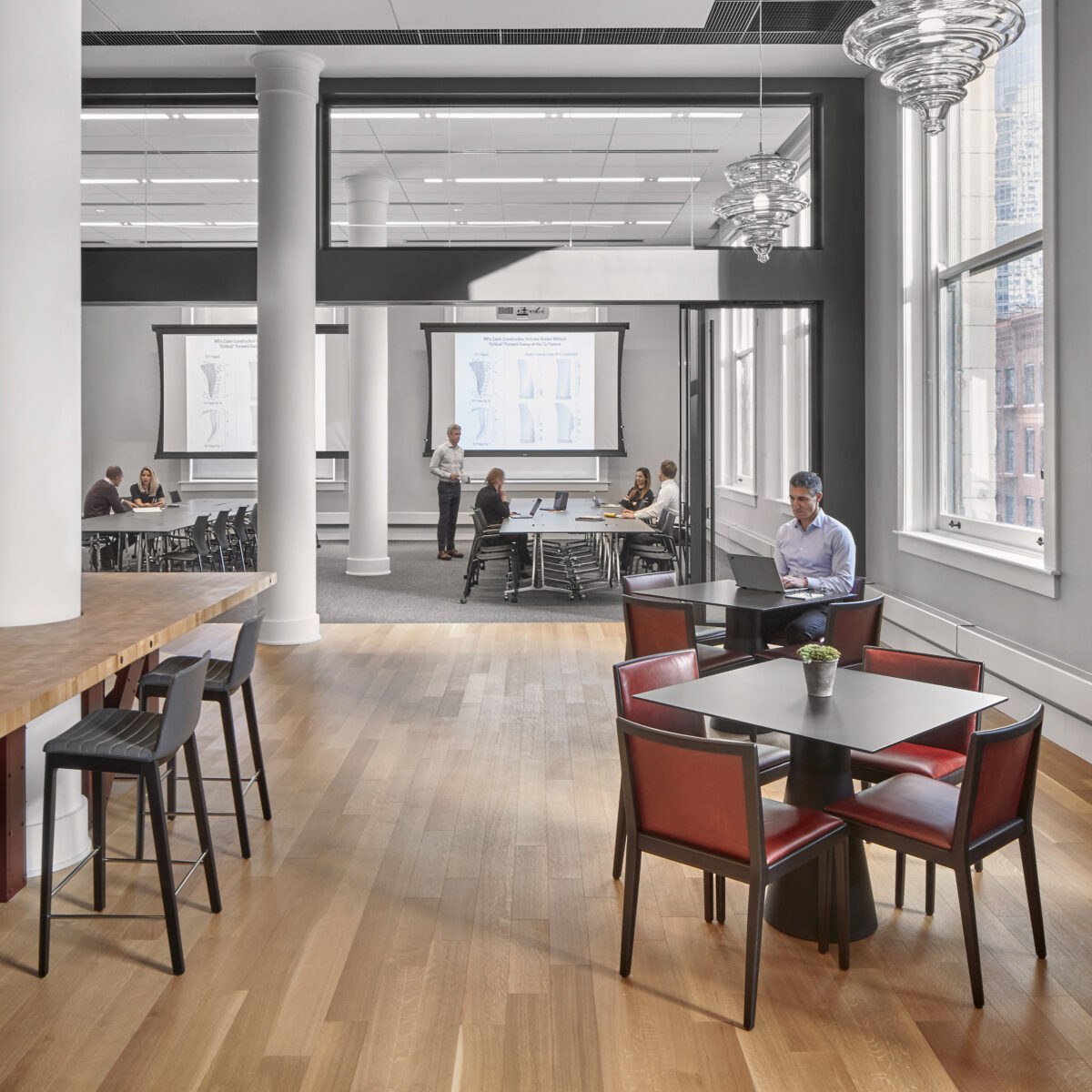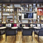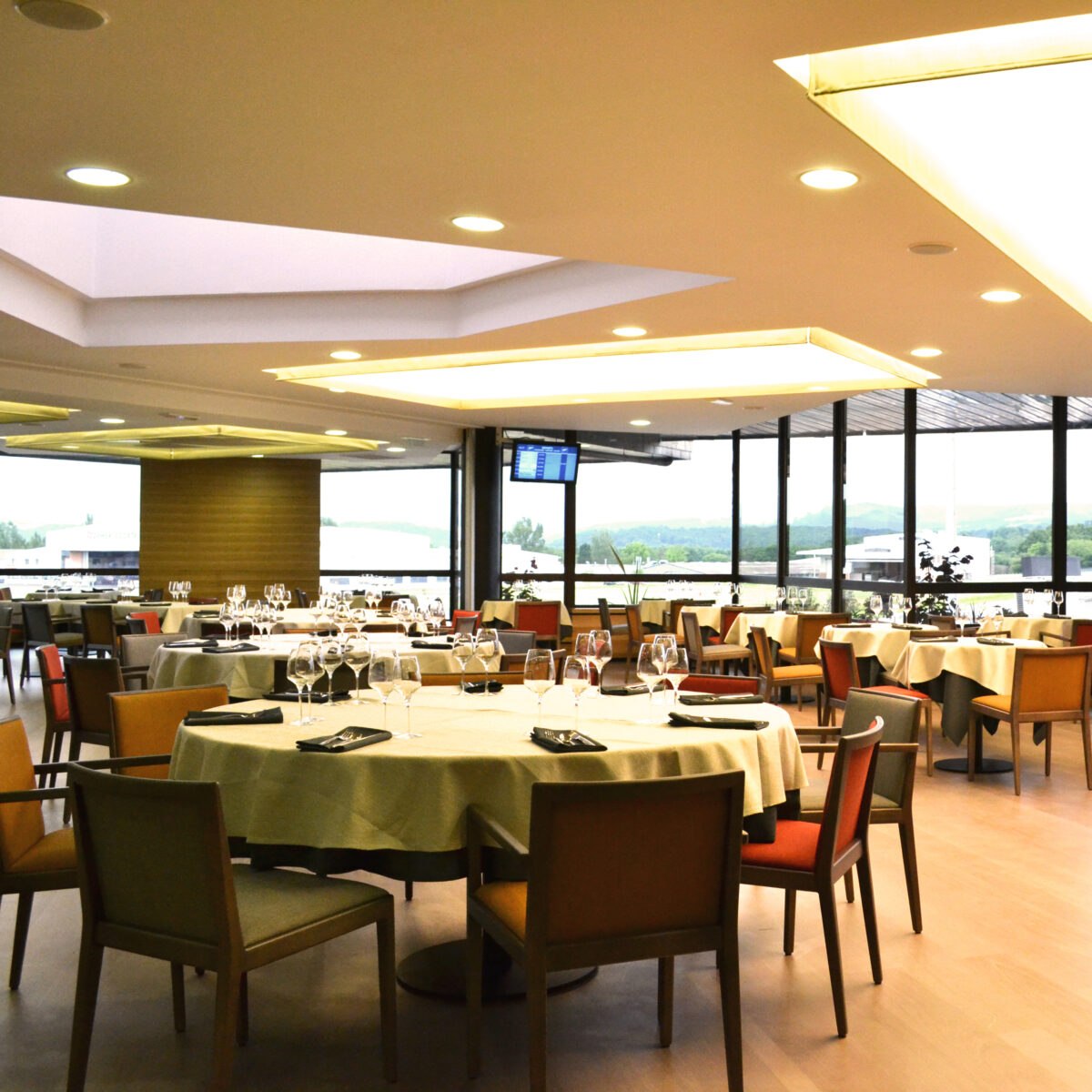- Hospitality Look: mehrere Designstühle im Ensemble, ruhige Farbpalette, solide Tischplatten.