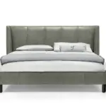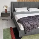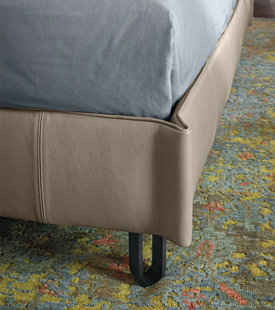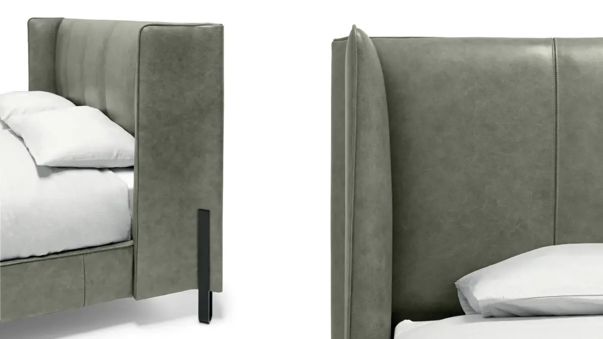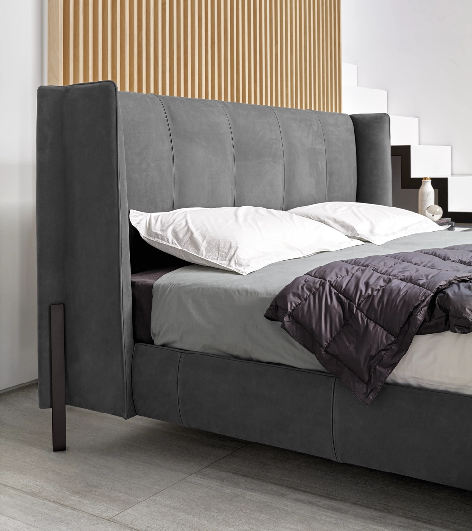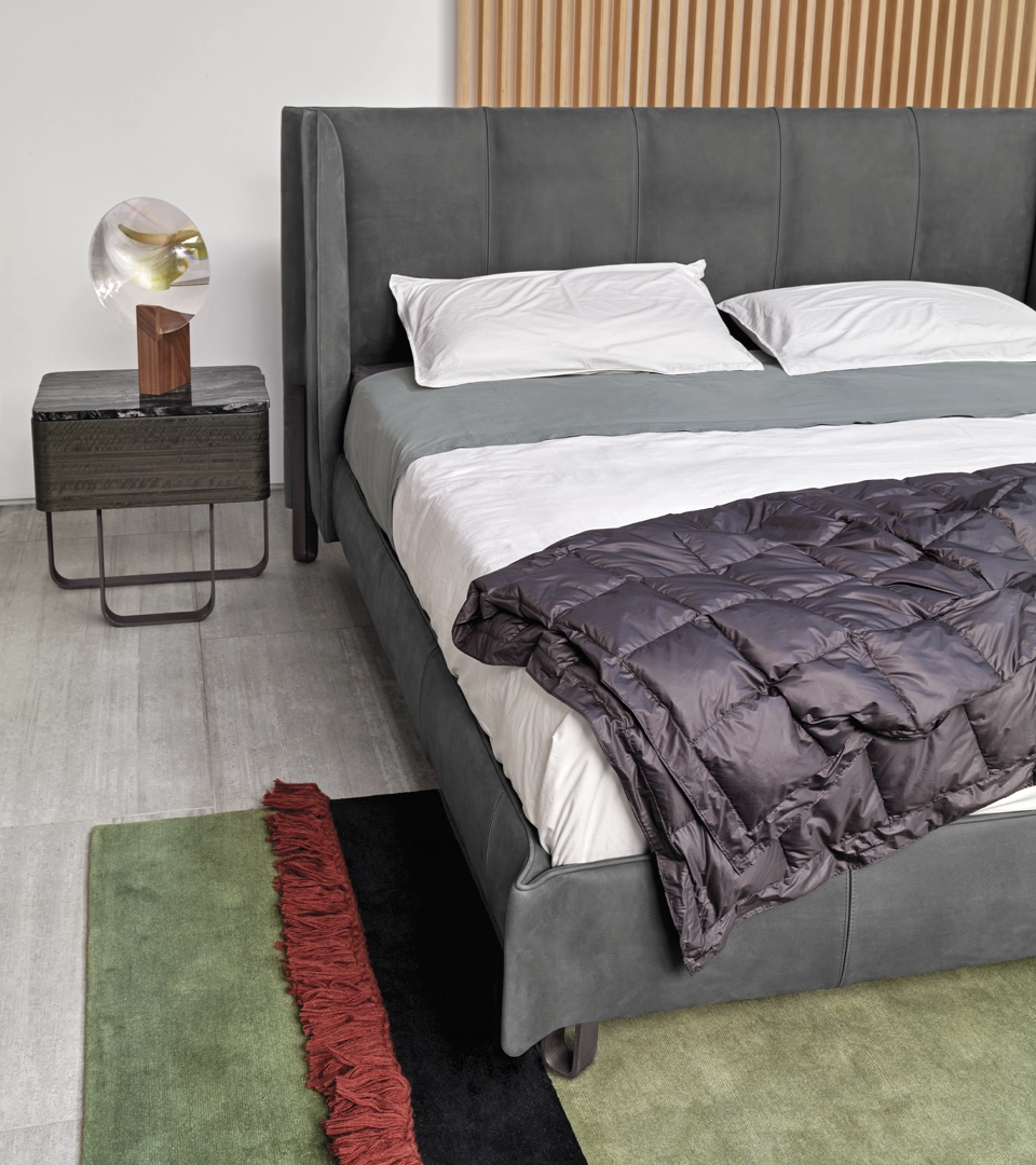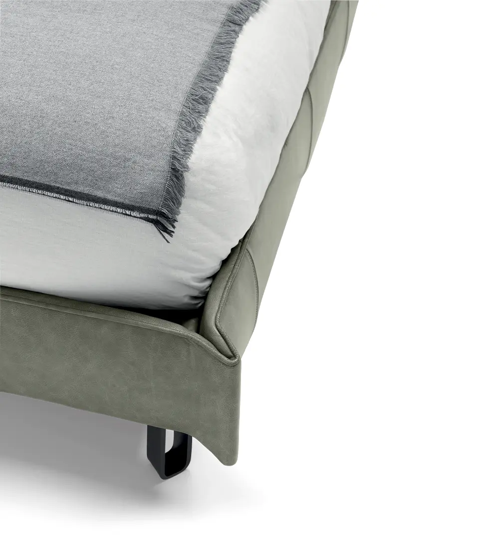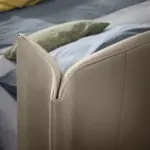 Typisch für Big Night ist das Kopfteil mit seiner leichten Faltung. Diese sorgt dafür, dass die Rückenlehne nicht wie eine einfache, gerade Fläche wirkt, sondern wie ein bewusst modelliertes Polsterelement. Die seitliche Fixierung durch ein dezentes Metallelement verleiht dem Bett einen hochwertigen, fast maßgeschneiderten Charakter. So entsteht eine optische Nische, in der man sich beim Lesen oder Entspannen anlehnen kann.