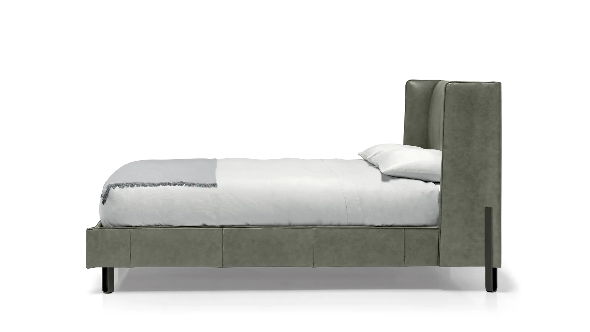 Typisch für Big Night ist das Kopfteil mit seiner leichten Faltung. Diese sorgt dafür, dass die Rückenlehne nicht wie eine einfache, gerade Fläche wirkt, sondern wie ein bewusst modelliertes Polsterelement. Die seitliche Fixierung durch ein dezentes Metallelement verleiht dem Bett einen hochwertigen, fast maßgeschneiderten Charakter. So entsteht eine optische Nische, in der man sich beim Lesen oder Entspannen anlehnen kann.