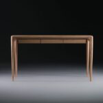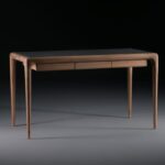 Schön und elegant wirkt der Designer Schreibtisch Latus aus Holz mit Lederauflage auf der Tischplatte. Es ist ein Werk von dem Designer Salih Teskeredžić, der für Möbel mit geschmeidigen Rundungen und Raffinessen bekannt ist. Auch bei dem Schreibtisch aus Massivholz wurde viel Wert auf abgerundet Ecken und Kanten gelegt. Durch den gleichmäßigen Schwung der Ecken und Kanten der Tischplatten und vorhandenen drei Schubladen wird ein Plus an Eleganz erzeugt. Trotz Eleganz wirkt der Schreibtisch Latus nostalgisch und schlicht. Abgerundet wird der Look des Schreibtischs für Ihr Büro der das Home Office durch die Lederauflage. An solch einem Schreibtisch mit passendem Stuhl lässt es sich zu jeder Zeit angenehm und komfortabel arbeiten.