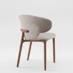 Der Mela Stuhl zeichnet sich durch seine klare Linienführung und die elegante Formgebung aus. Die Rücken- und Armlehnen bilden eine einheitliche Struktur, die die Sitzfläche umschließt und so eine einladende, komfortable Hülle schafft. Diese Gestaltung betont die natürliche Schönheit des verwendeten Holzes und die feine Textur der Polsterung.