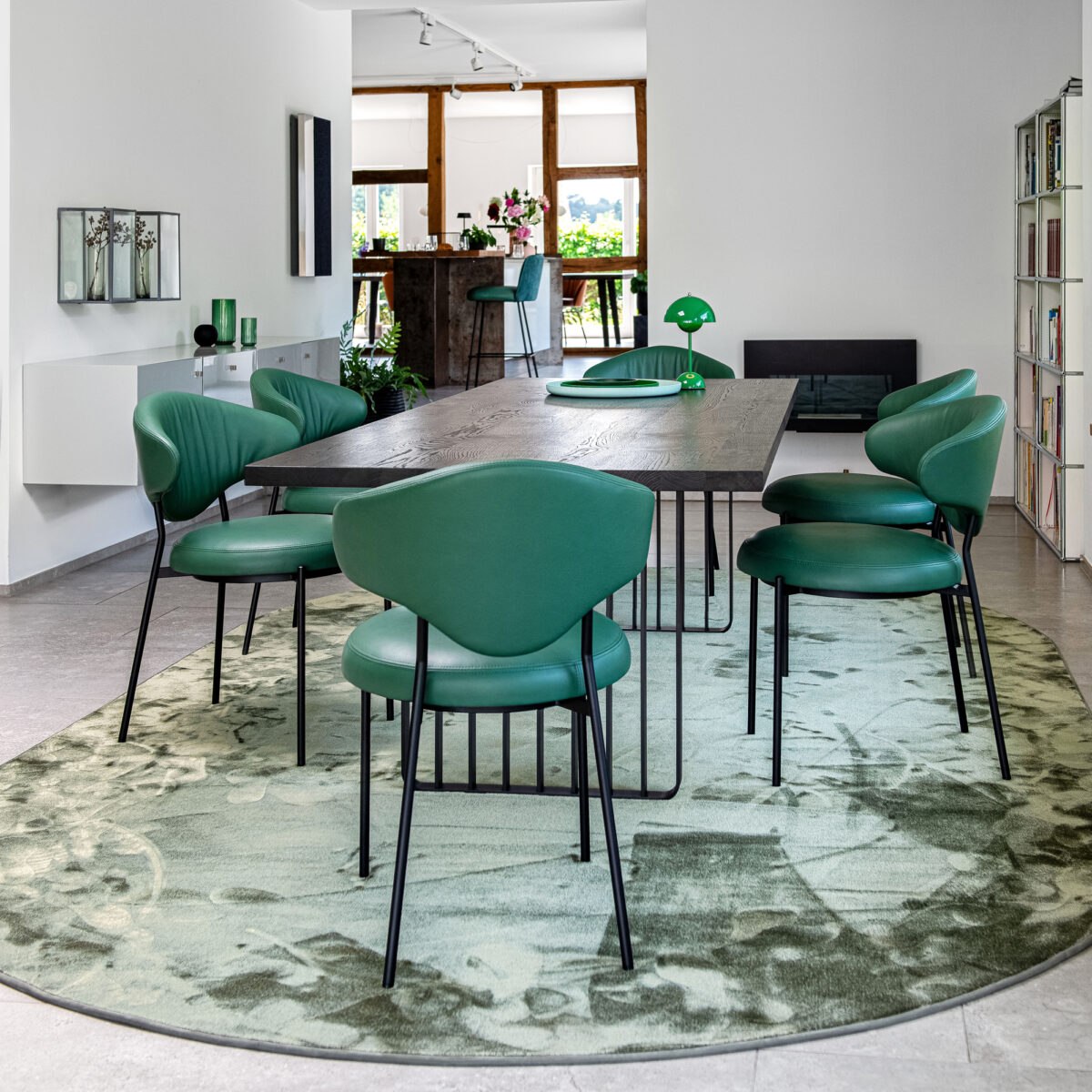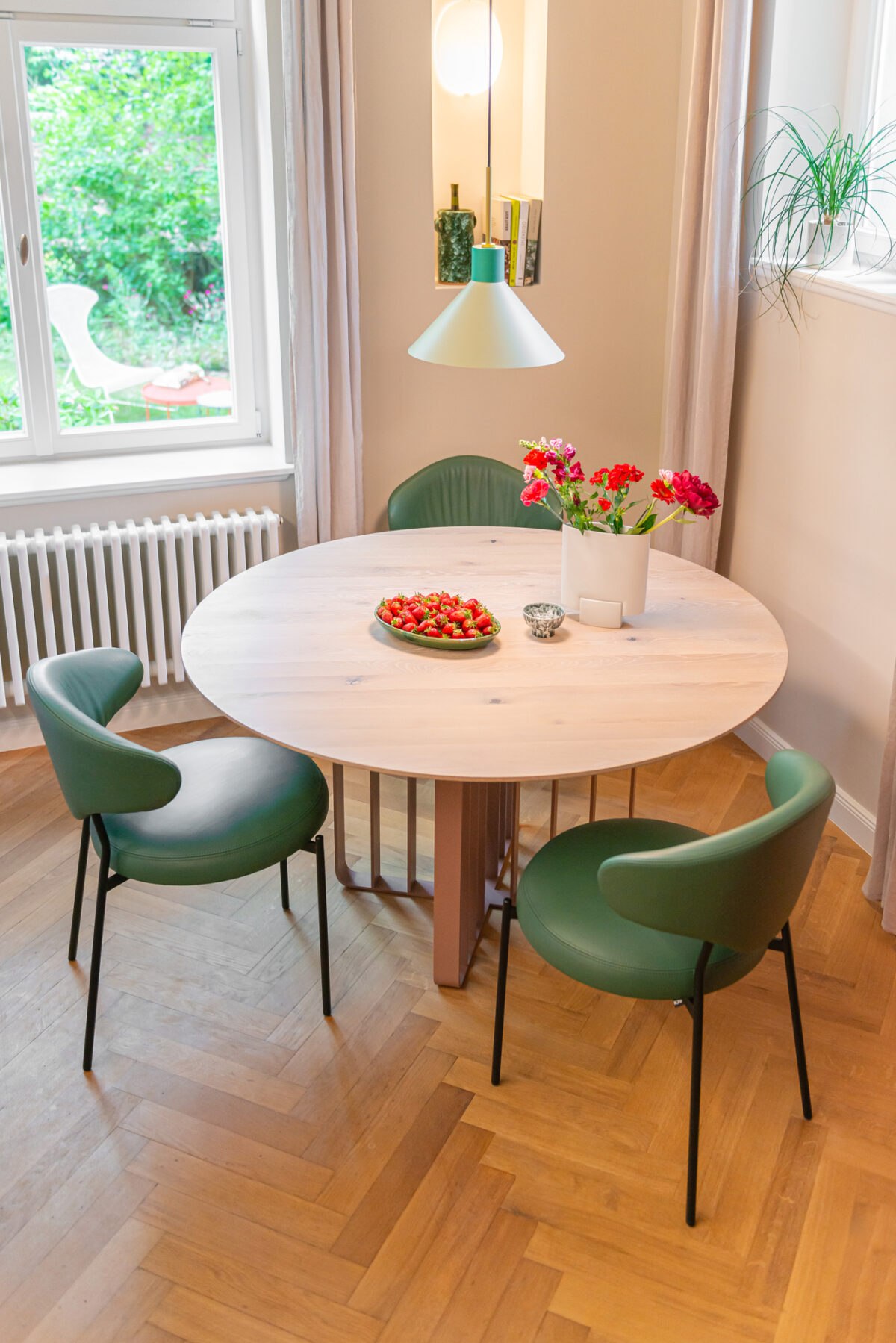 Je nach Ausführung stehen verschiedene Holzarten und Oberflächen zur Auswahl. So kann der Tisch gezielt auf bestehende Möbel und Bodenbeläge abgestimmt werden.