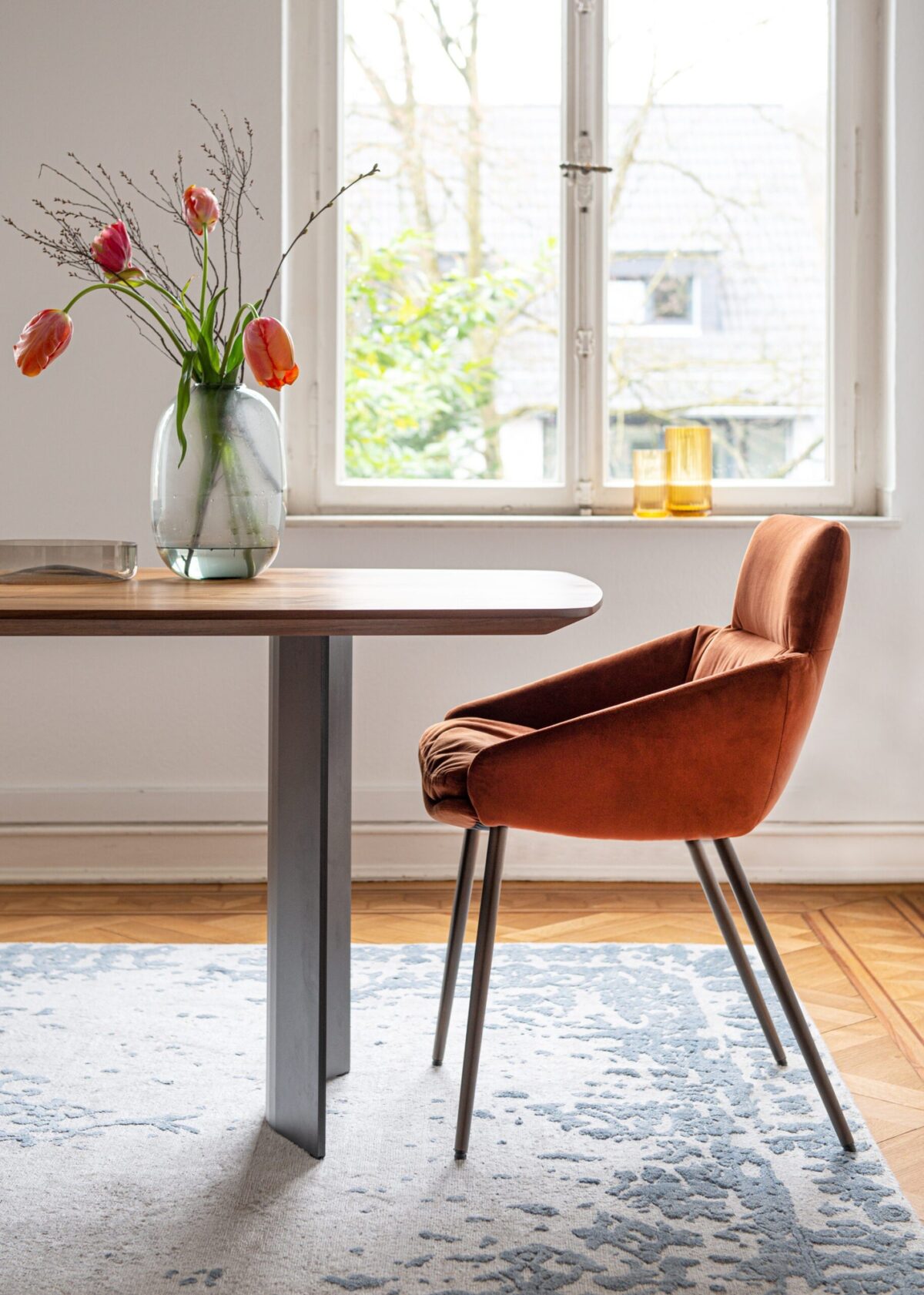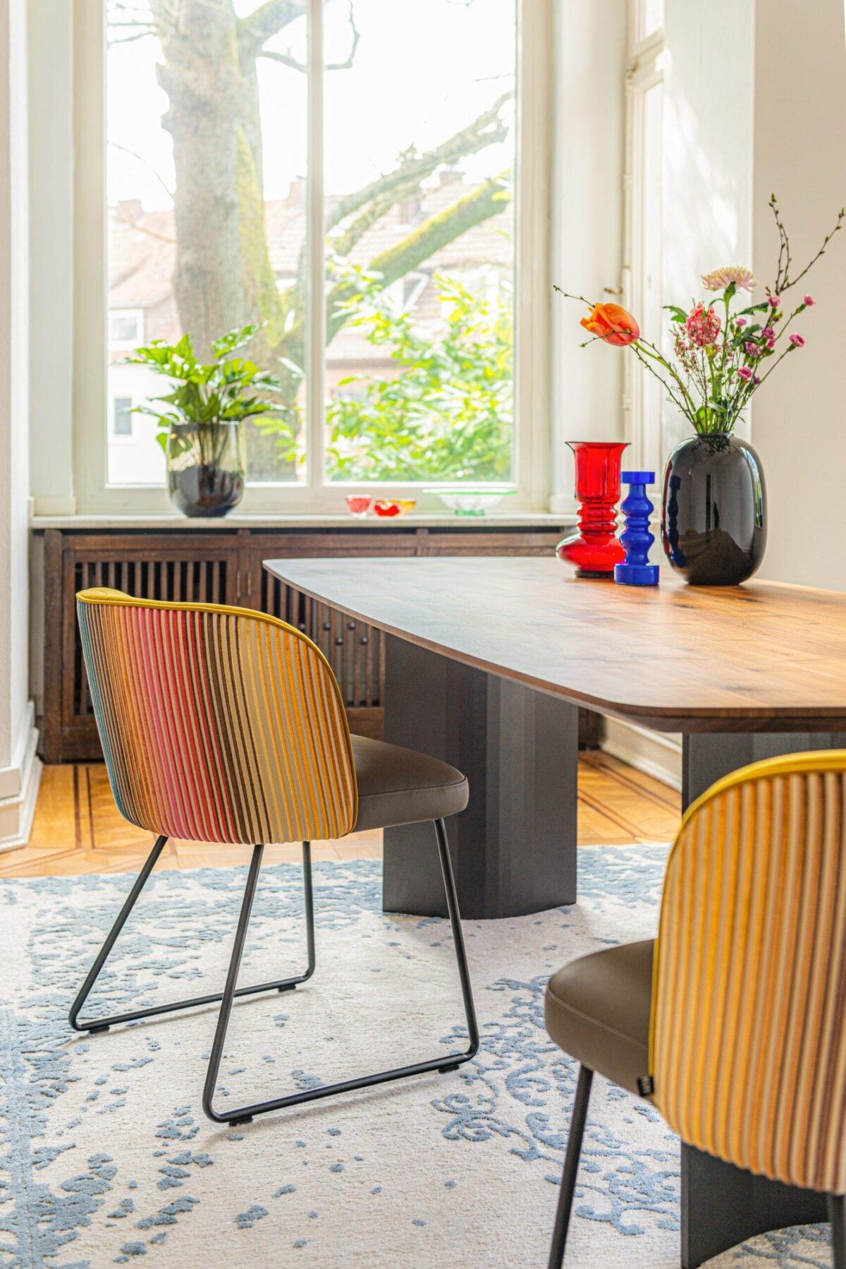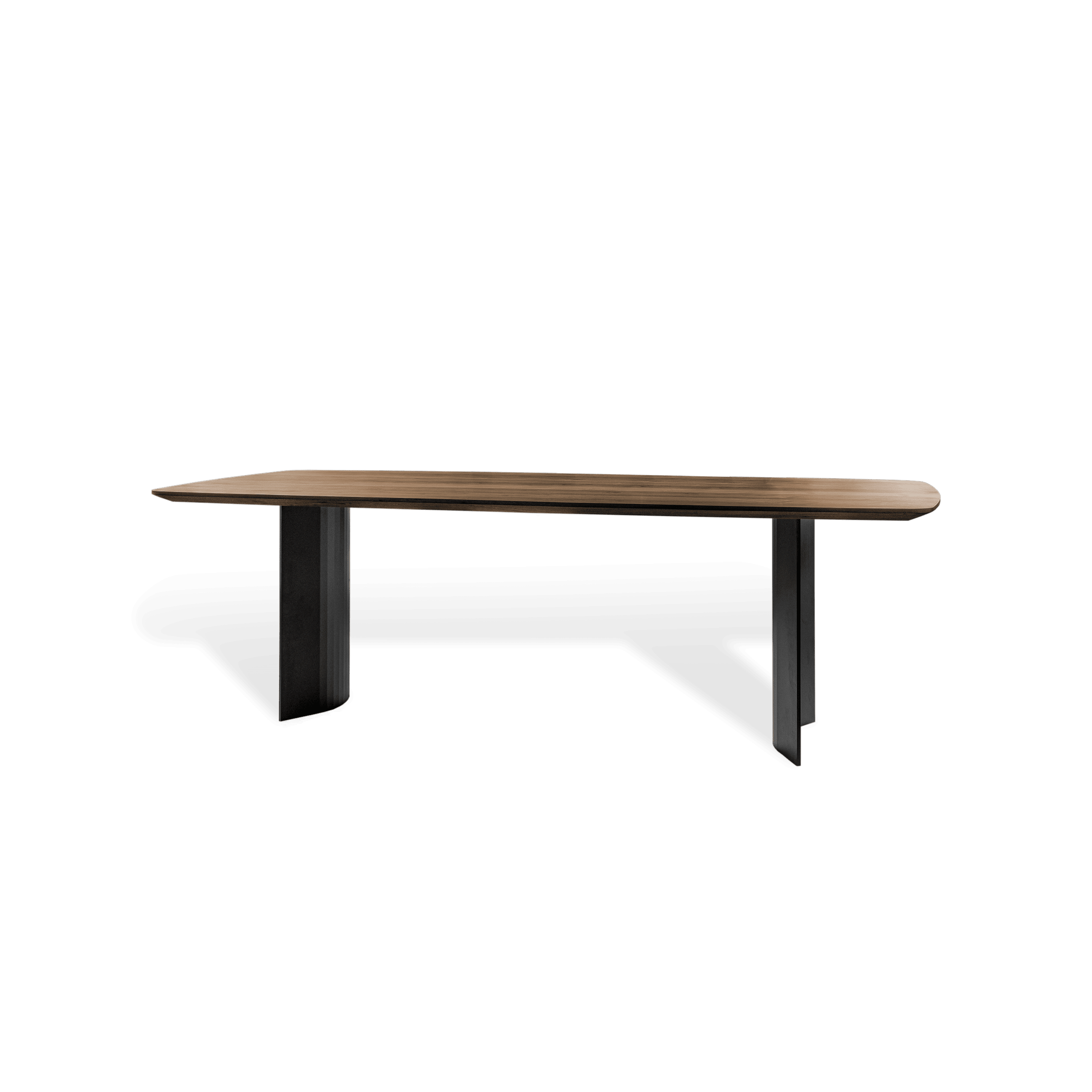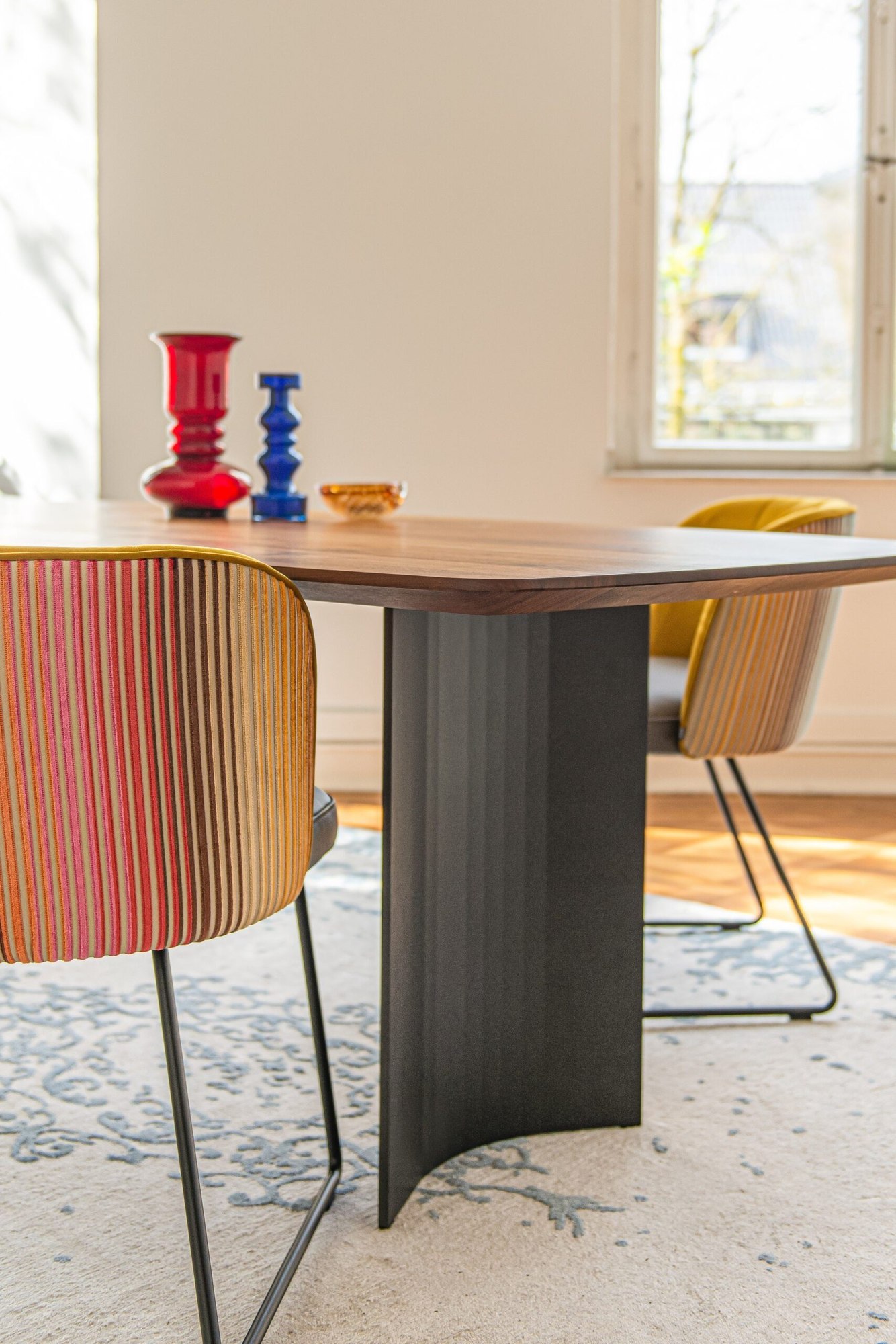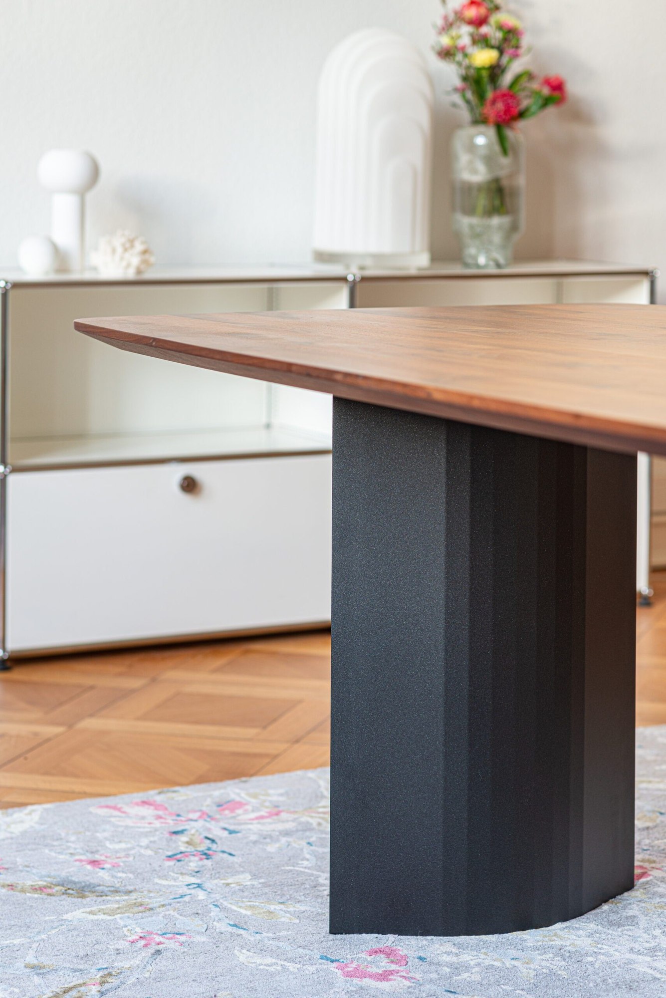 Die konkav geformten Stahlwangen bestehen aus pulverbeschichtetem Stahlblech und tragen die massiven Tischplatten sicher und elegant. Durch die komplex gefalteten Flächen entstehen bei unterschiedlichem Lichteinfall immer neue Reflexionen – dieser Effekt macht den Tisch nicht nur funktional, sondern auch zu einem bewegten Kunstobjekt im Raum. Gleichzeitig bleibt der Tercio ergonomisch durchdacht: Die filigranen Wangen bieten großzügigen Fußraum, sodass bequemes Sitzen über längere Zeit möglich ist.