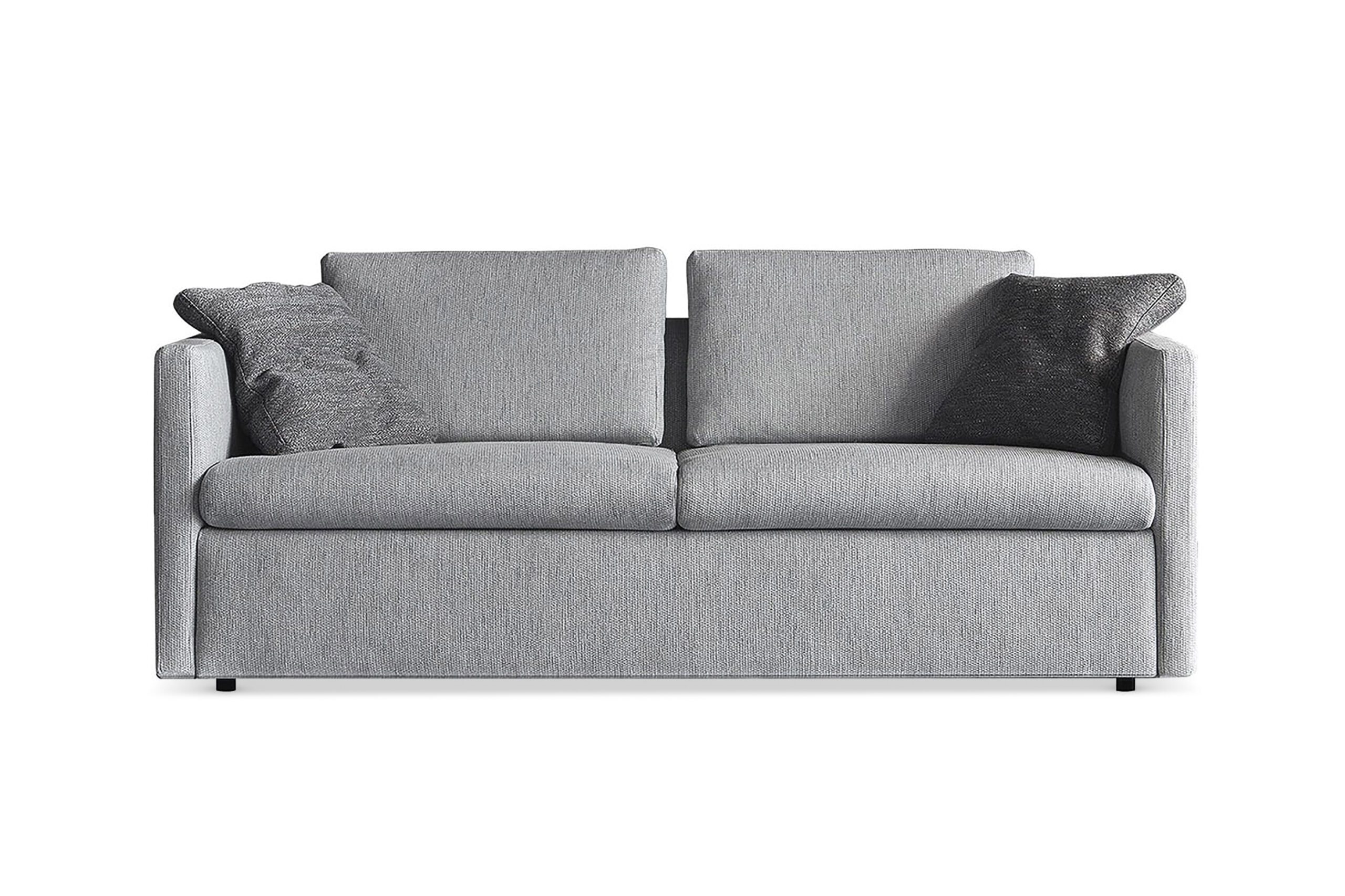 Das Swing Schlafsofa besticht durch ein zeitgemäßes, geradliniges Design mit dünnen Armlehnen und klar definierten Proportionen. Die schmalen Armlehnen stehen auf gleicher Höhe wie die Rückenlehne, wodurch eine elegante, harmonische Silhouette entsteht. Die Polsterung mit hochwertigen Schaumstoffkissen sorgt für ein komfortables Sitz- und Liegegefühl, unterstützt durch ein diskretes Rollo-Kopfkissen zur Nackenstütze.