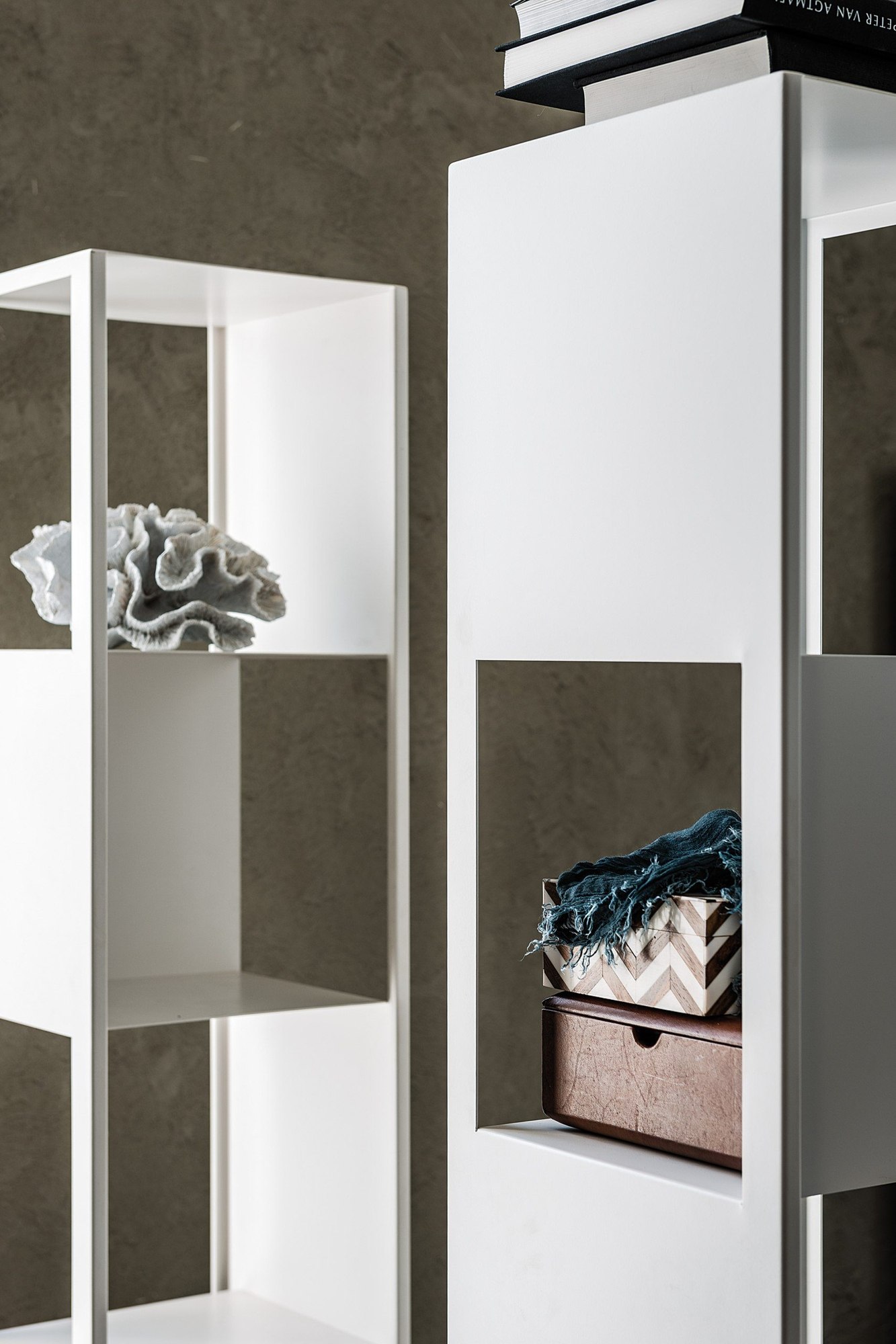Das Joker Regal zeichnet sich durch seine asymmetrische, architektonische Formensprache aus. Die klar definierten Linien und offenen Fächer schaffen eine dynamische Optik, die Bücher, Wohnaccessoires oder Dekorationsobjekte bewusst in Szene setzt. Durch die offene Gestaltung wirkt das Regal leicht und modern, ohne den Raum optisch zu beschweren.
