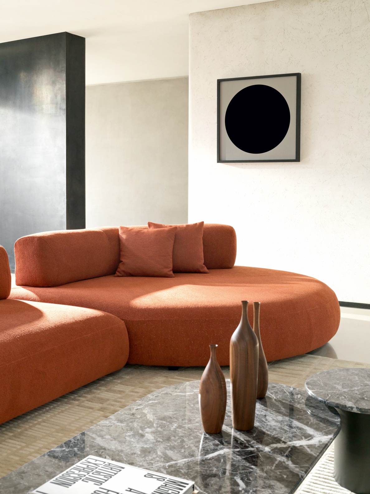 Die Idee hinter Isla ist eine lockere, informelle Sitzlandschaft. Die runden und halbgerundeten Formen brechen starre Linien auf und lassen den Raum größer und moderner wirken. Statt strengen Kanten sieht man weiche Übergänge, großzügige Sitzflächen und angenehm geformte Rücken. Dadurch passt Isla in offene Wohnbereiche, Designlofts, moderne Häuser, aber auch in bestehende Einrichtungen, die ein hochwertiges Einzelstück vertragen.