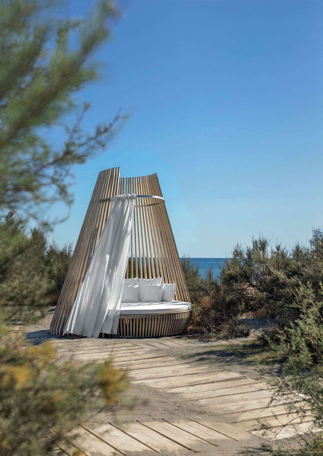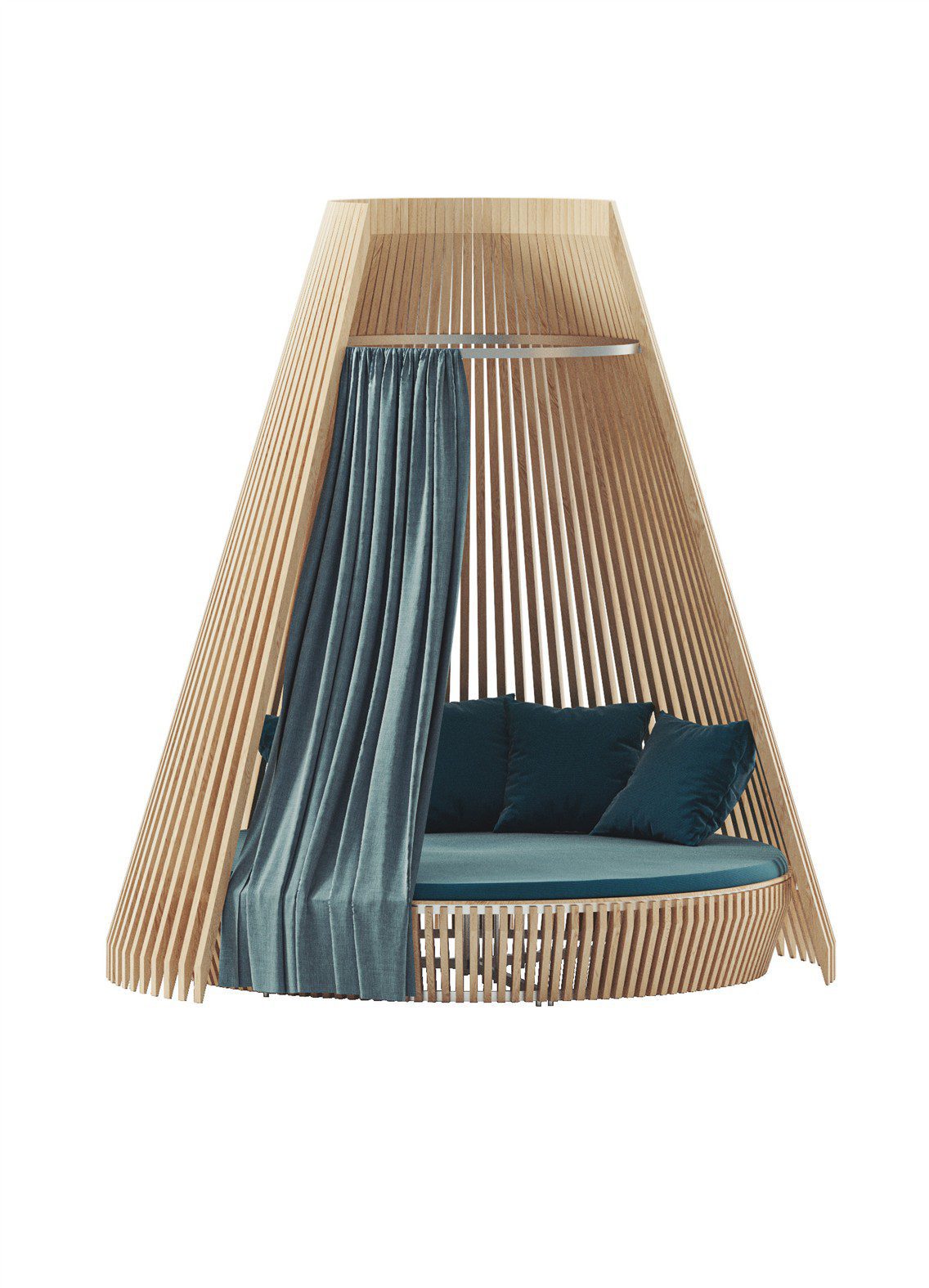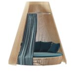 Das Sofa zeichnet sich durch eine architektonisch inspirierte Gestaltung aus, die sowohl Schutz als auch Struktur bietet. Die Kombination aus klaren Linien und harmonischen Proportionen sorgt für eine moderne Optik, die sich nahtlos in hochwertige Outdoor-Konzepte integriert. Durch seine besondere Formgebung wirkt das Sofa nicht nur als Sitzmöbel, sondern auch als gestalterisches Element im Außenbereich.