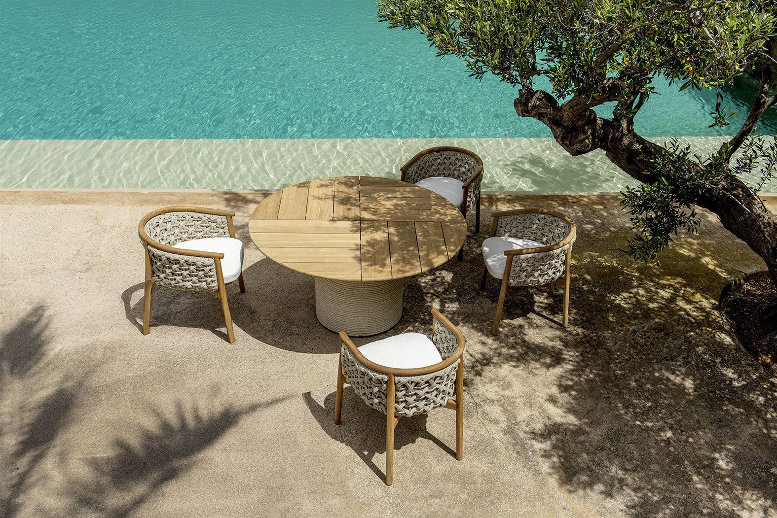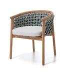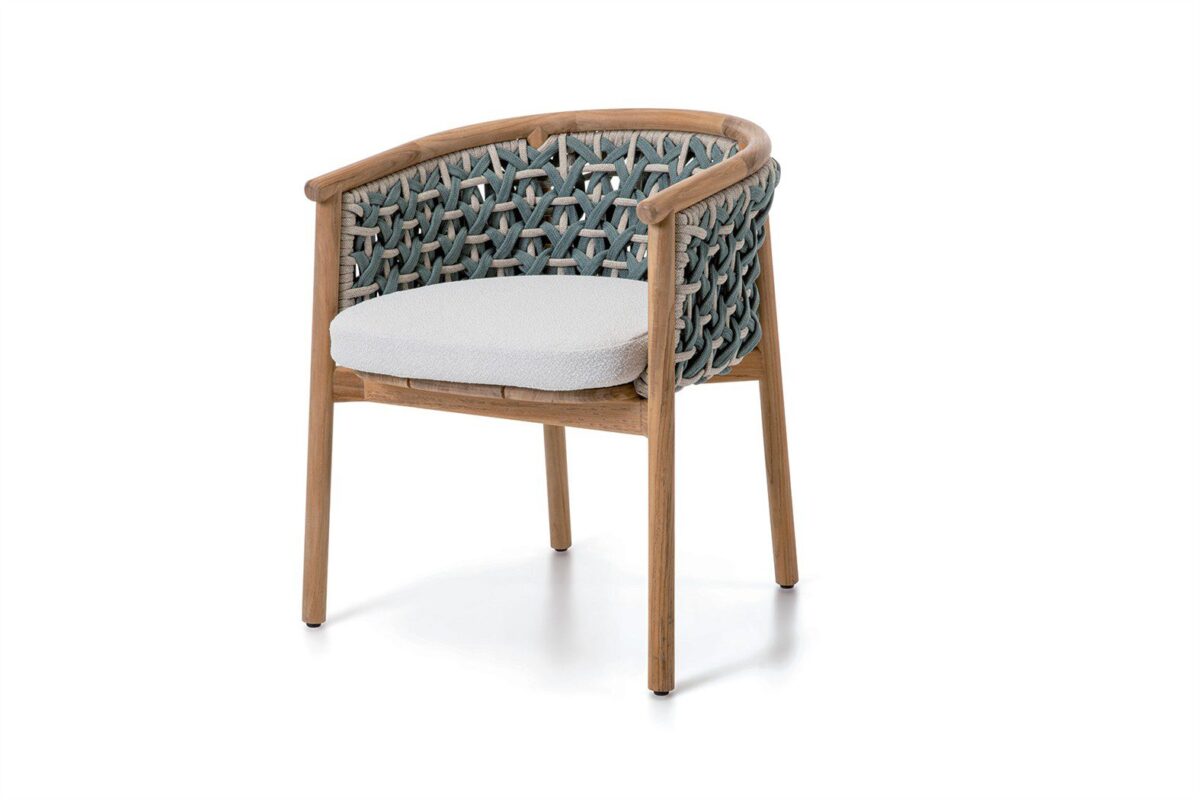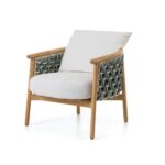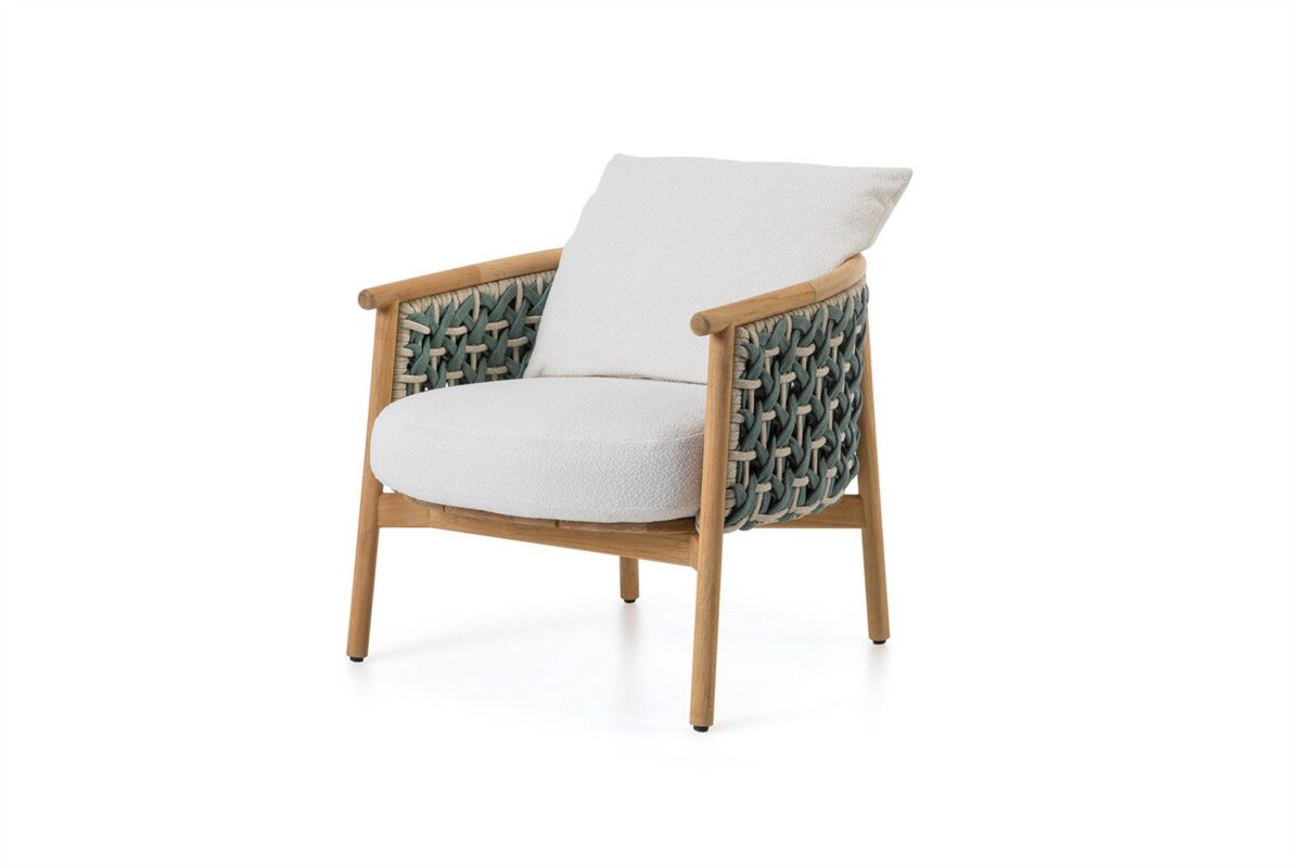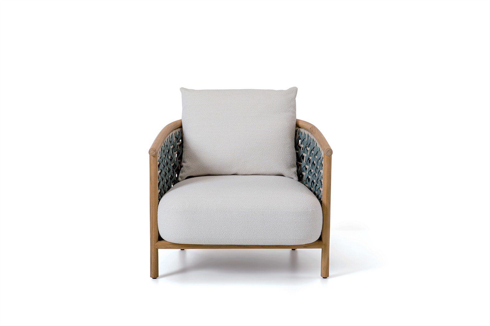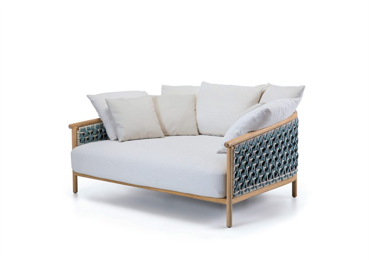 Das Gestell des Sofas besteht aus natürlichem Teakholz, einem besonders widerstandsfähigen und langlebigen Material, das ideal für den Außenbereich geeignet ist. Ergänzt wird die Konstruktion durch ein wetterfestes Seilgeflecht, das in aufwendiger Handarbeit gefertigt wird und dem Sofa seine charakteristische, elegante Optik verleiht.