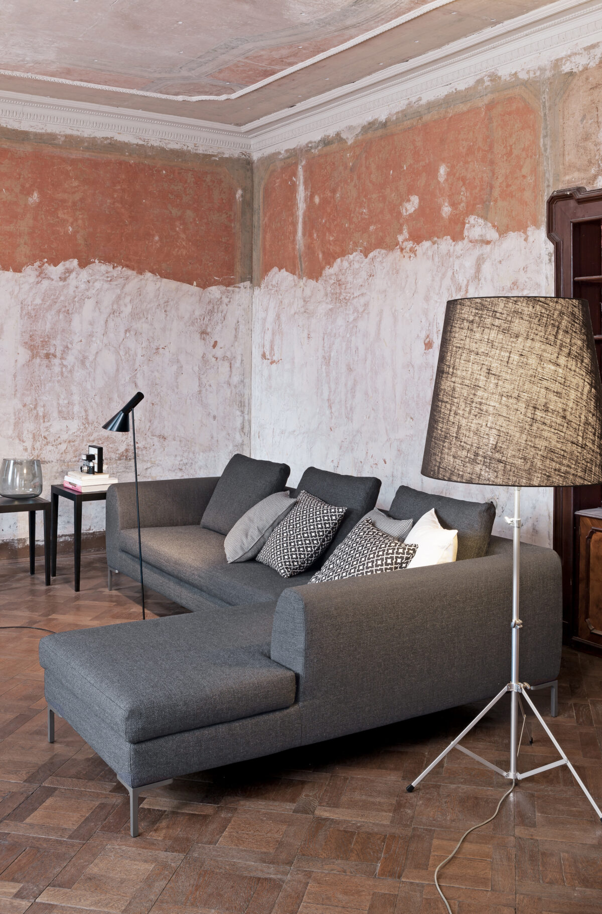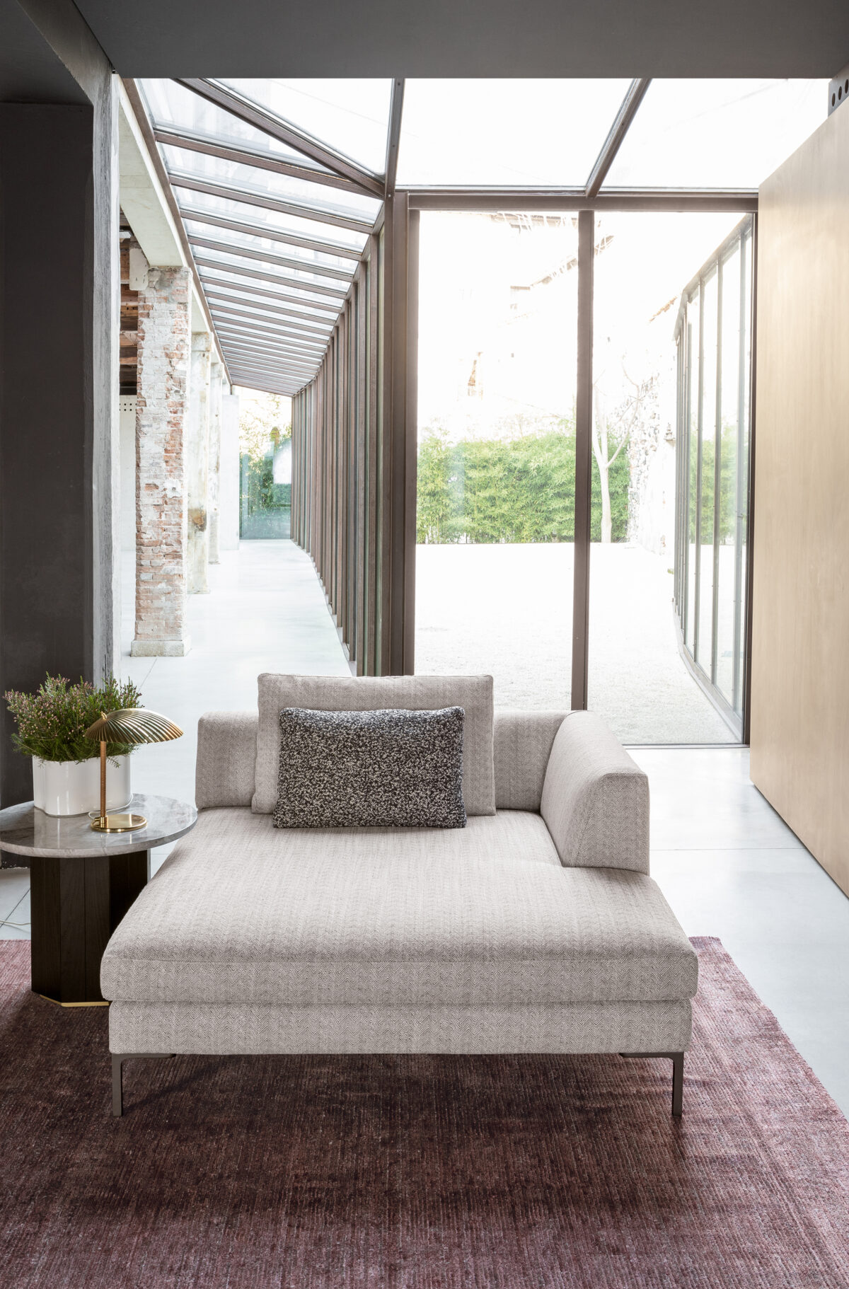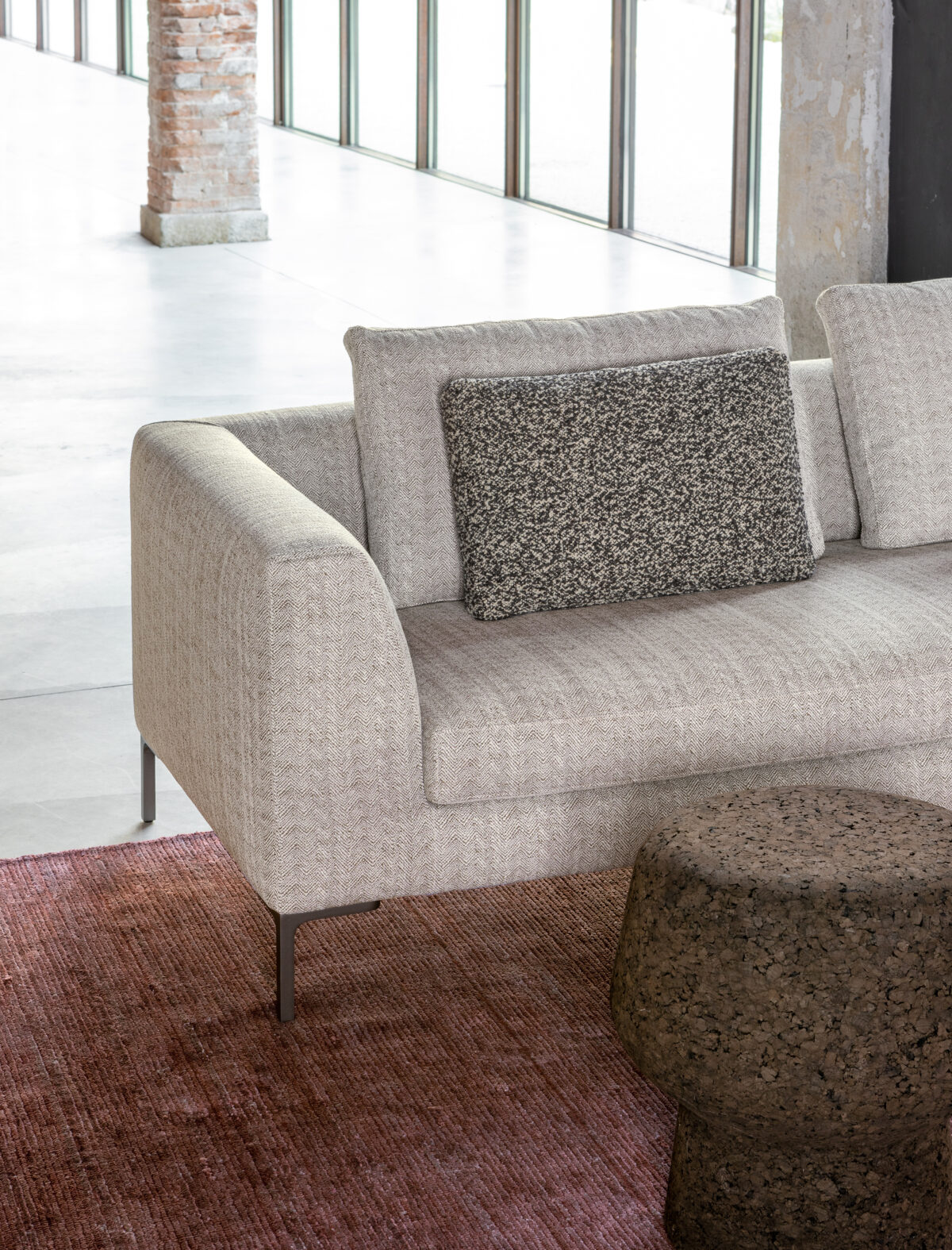 Dank seiner ausgewogenen Proportionen wirkt das Sofa zugleich elegant und einladend. Die sorgfältig gestalteten Armlehnen sowie die fein ausgeführten Nähte unterstreichen den hochwertigen Charakter dieses italienischen Designmöbels.