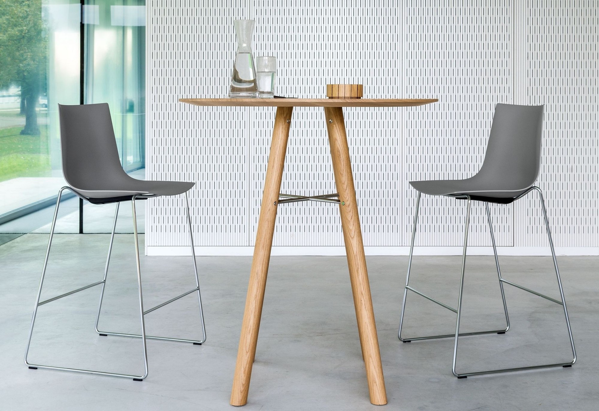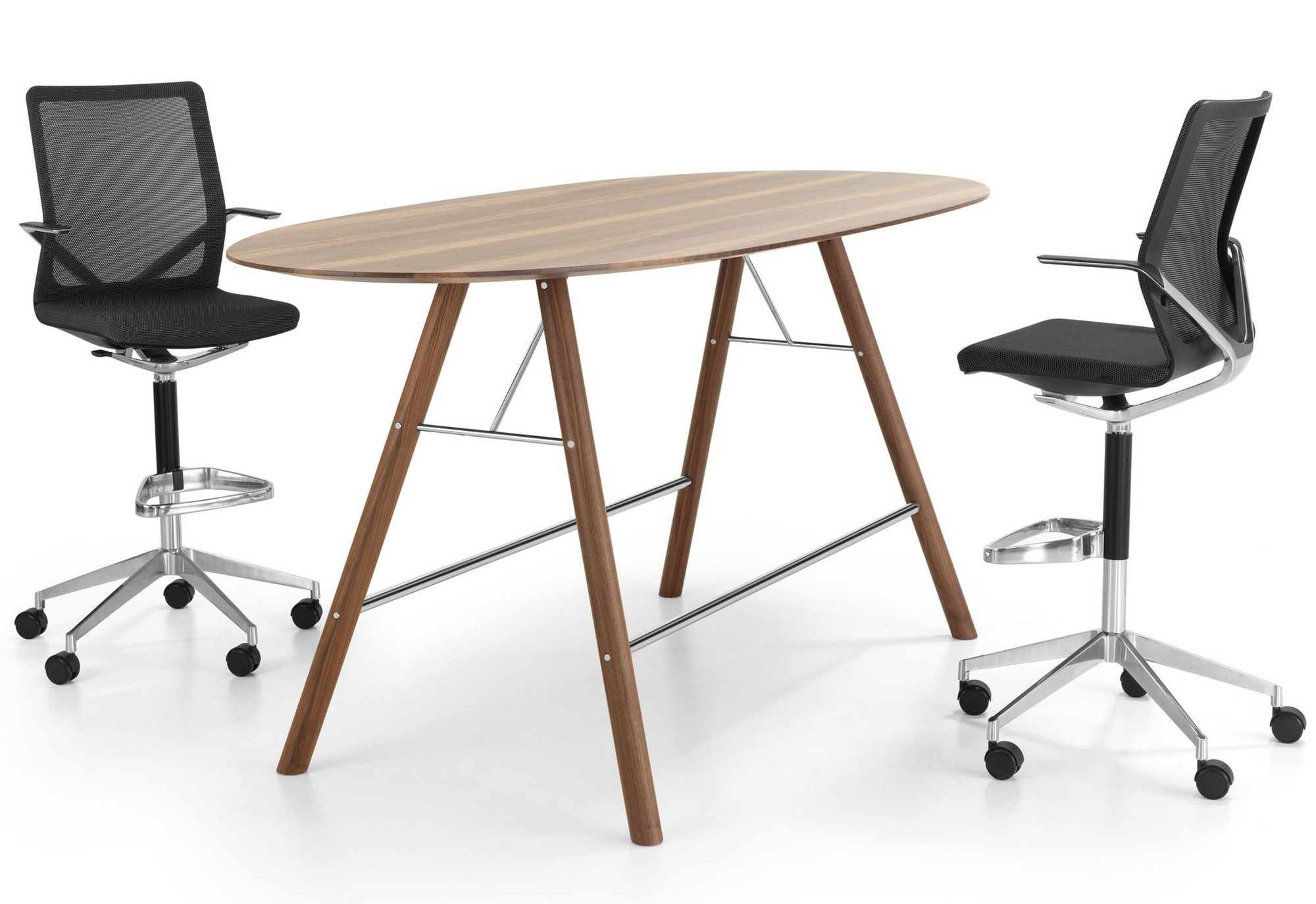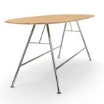 Die besondere Konstruktion des Aiko High beeindruckt durch ihre selbsttragende Bauweise ohne störende Traversen. Versteifungskreuze aus hochwertigem Stahl gewährleisten maximale Stabilität bei elegantem Erscheinungsbild. Die abgeschrägte Unterkante der Tischplatte verleiht dem Hochtisch seine charakteristische Leichtigkeit, während die Universal-Kunststoffgleiter einen sicheren Stand garantieren.