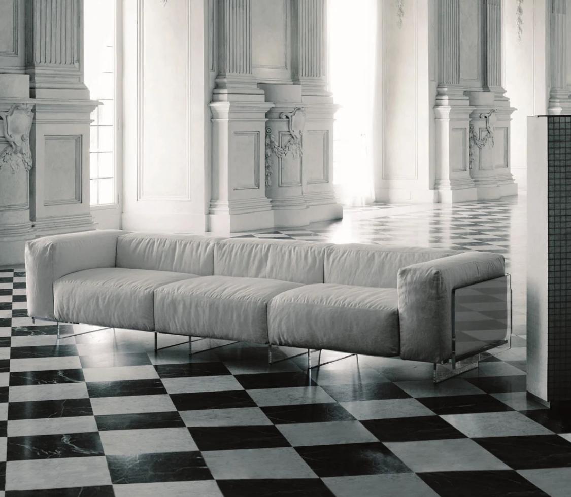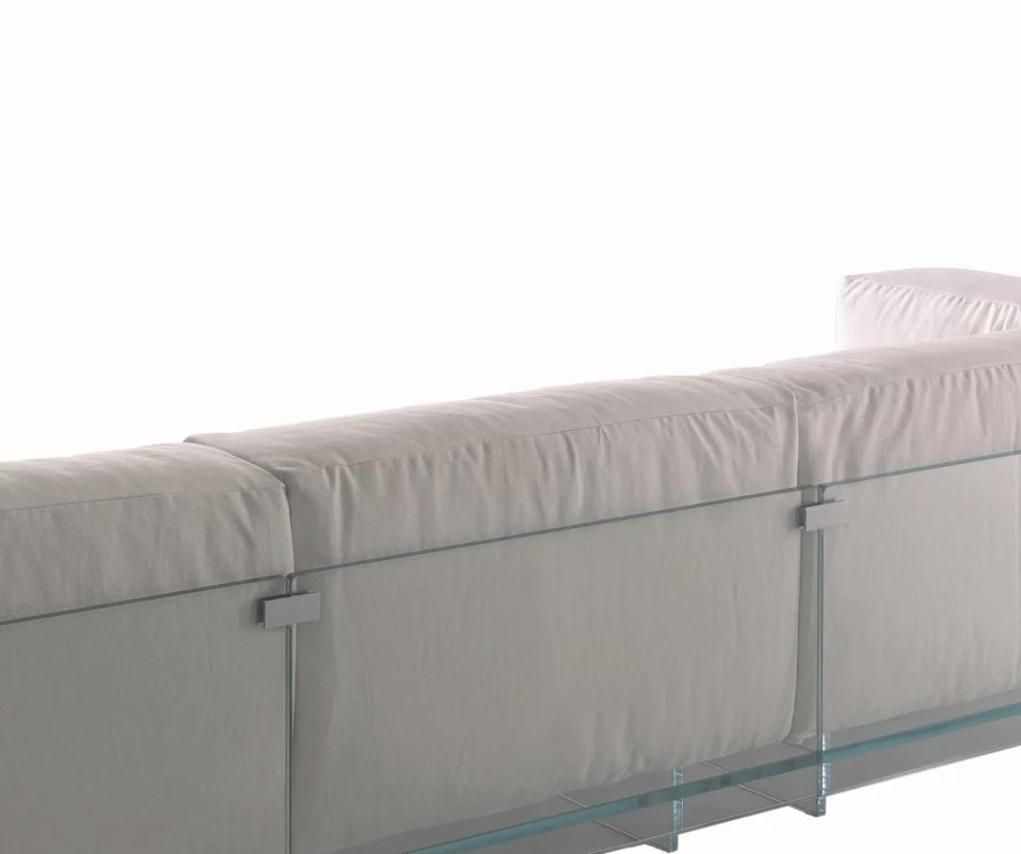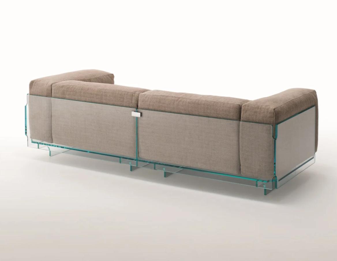 Die Faszination dieses Sofas liegt in der radikalen Materialwahl. Während herkömmliche Sofas durch massive Untergestelle Raum beanspruchen, nutzt die Crystal Lounge die Klarheit von Glas: