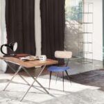 Der Schreibtisch Novelist von Lema stellt eine extravagante und spezielle Büroausstattung dar, der zwar sehr zierlich wirkt, dennoch sehr funktionell und speziell ist. Das Modell von Lema ist ziemlich leichtbeinig und wohnlich und daher ein perfekter Arbeitsplatz für das Home Office. Dank des schicken und edlen Designs macht das Lema Produkt auch im Wohnzimmer, welches mit einem separaten kleinen Arbeitsbereich versehen ist, eine gute Figur. Entworfen wurde das spektakuläre Modell von Christophe Pillet für den Hersteller Lema. Suchen Sie ein besonders ausgefallenes und spannendes Möbelstück für den heimischen Schriftverkehr, ist das hier angebotene Modell wie für Sie gemacht. Das Lema Modell integriert sich optimal in nahezu jedem Raum und bringt im Prinzip sogar frischen Wind hinein. Die Auswahl an edlen Materialien kann sich sehen lassen. Die Tischplatte besteht aus Nussbaum und das Gestell erscheint im glänzenden Chrom. Eine gute Kombination wurde getroffen, sodass der Schreibtisch Novelist von Lema besonders extravagant wirkt.