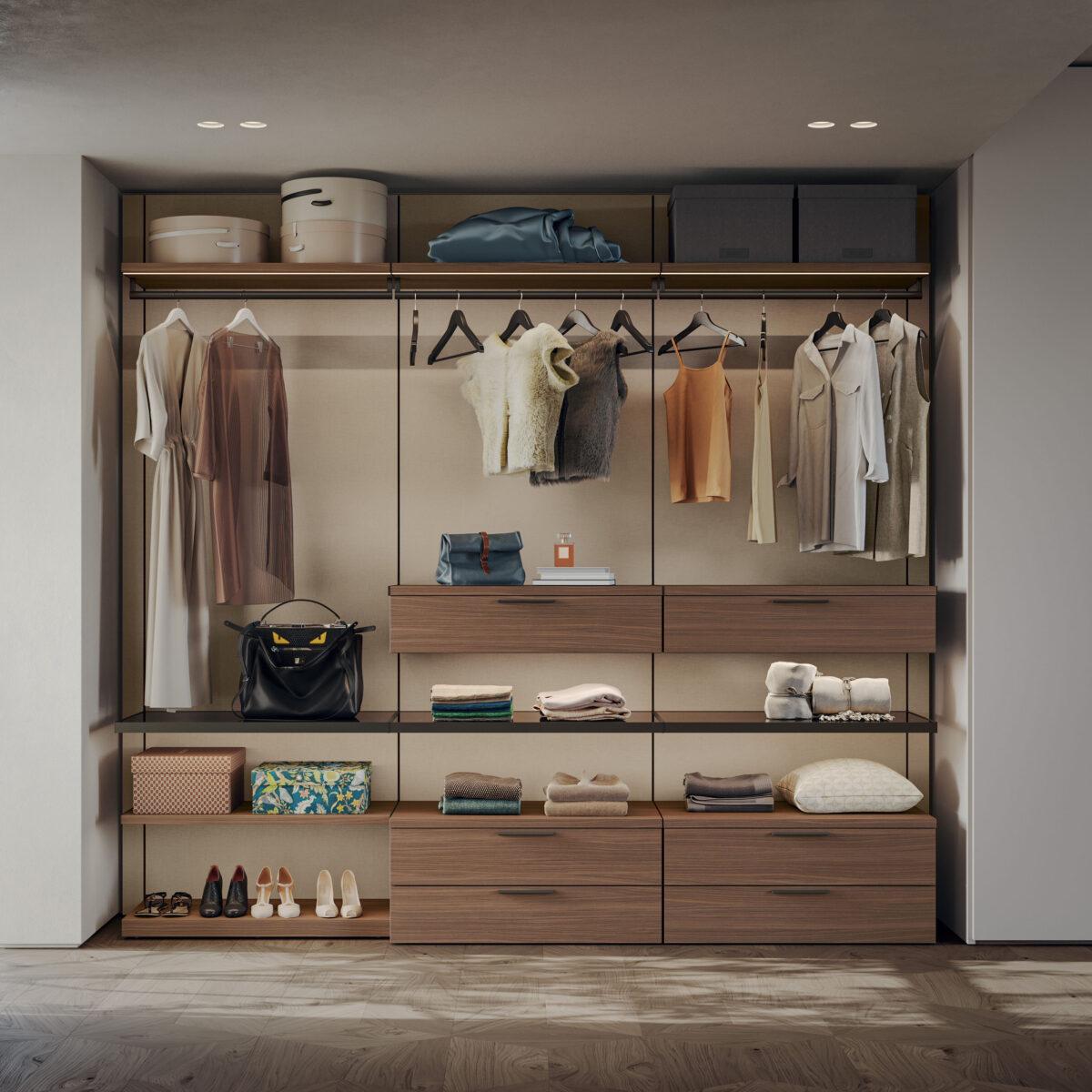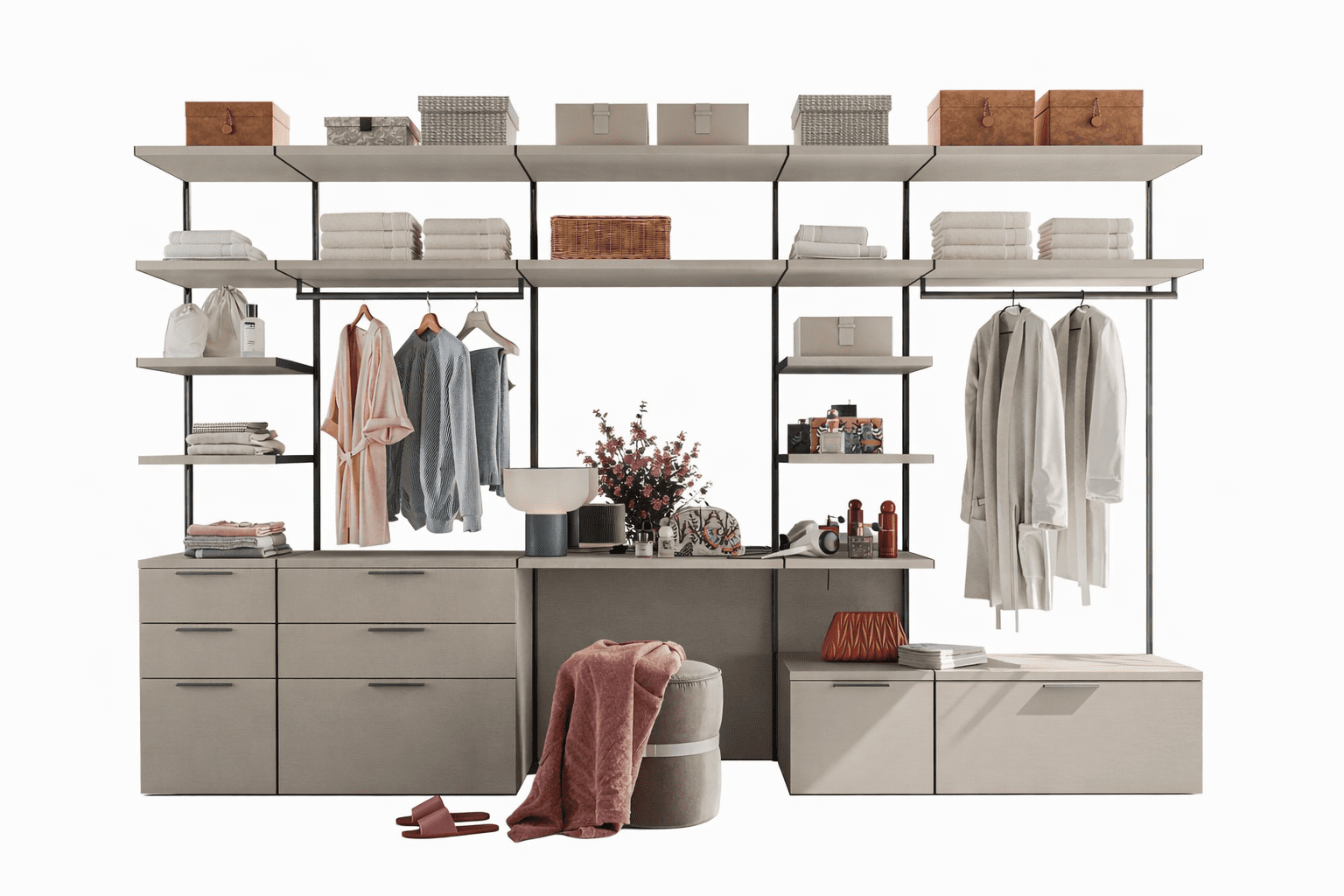 Morassutti steht für italienische Handwerkskunst, die sich durch hochwertige Materialien und eine modulare Flexibilität auszeichnet. Das System der begehbaren Schränke verzichtet auf starre Korpusse und setzt stattdessen auf ein luftiges, offenes Design, das Ihren Raum optisch vergrößert.