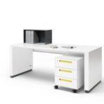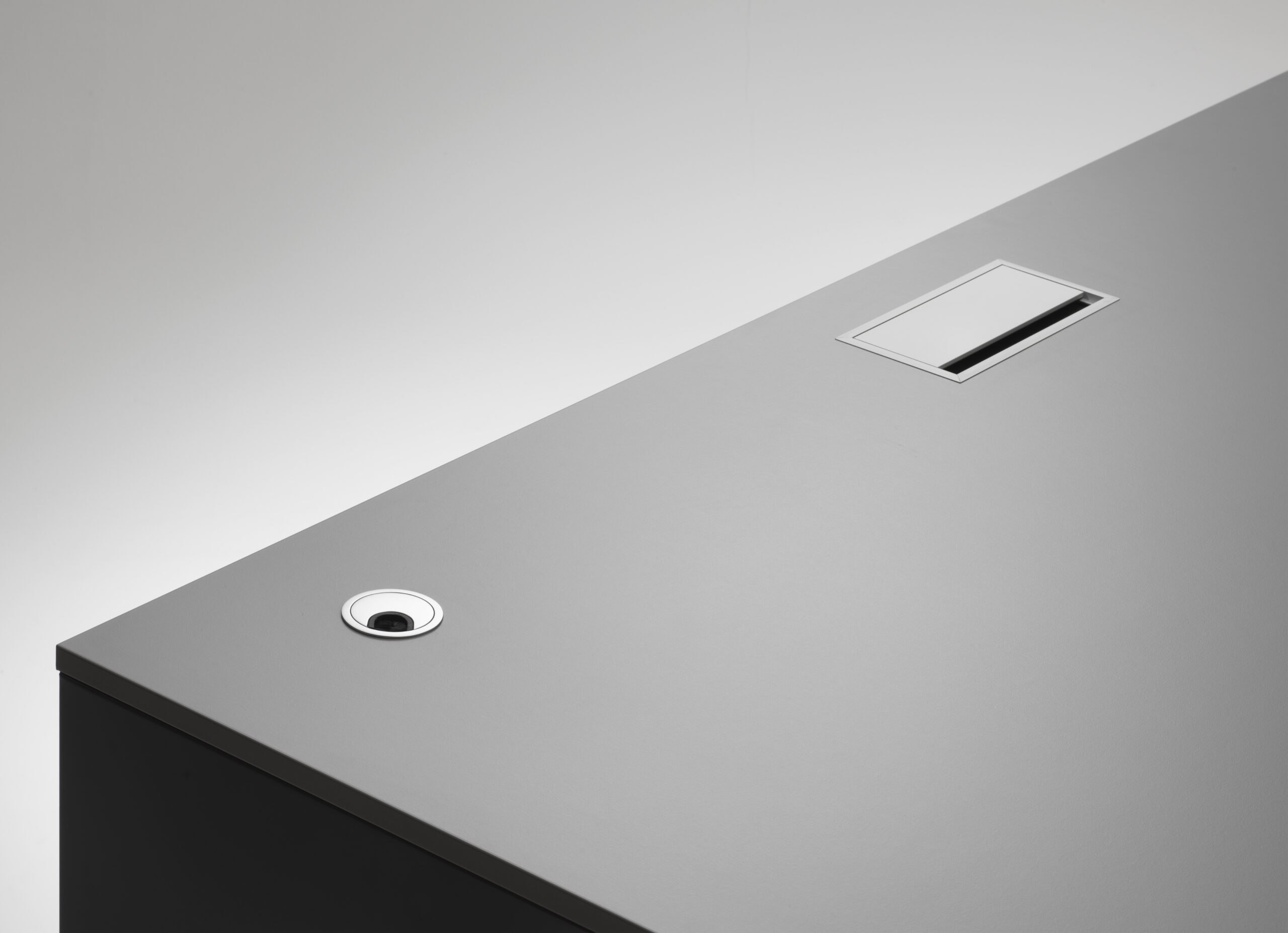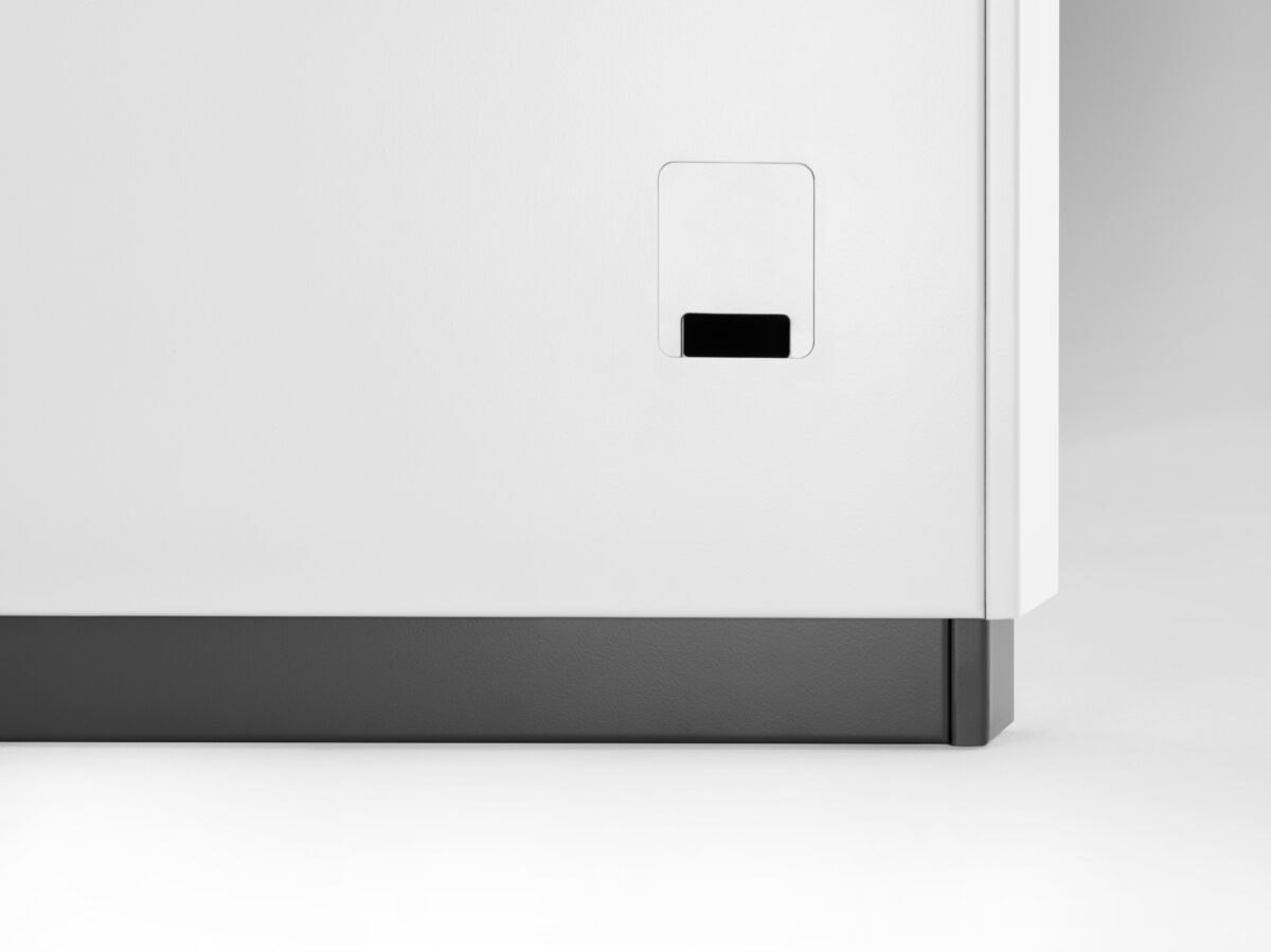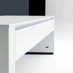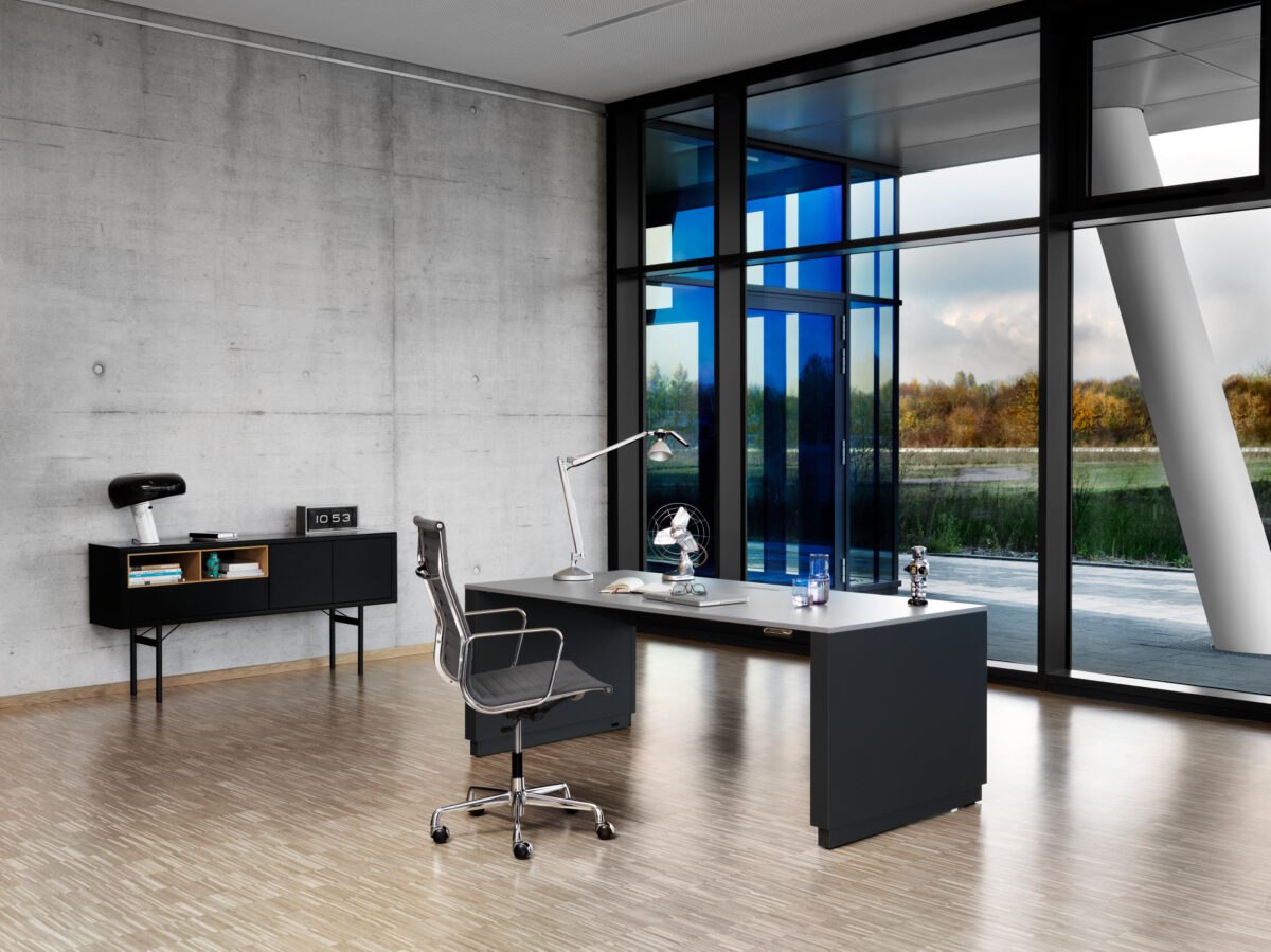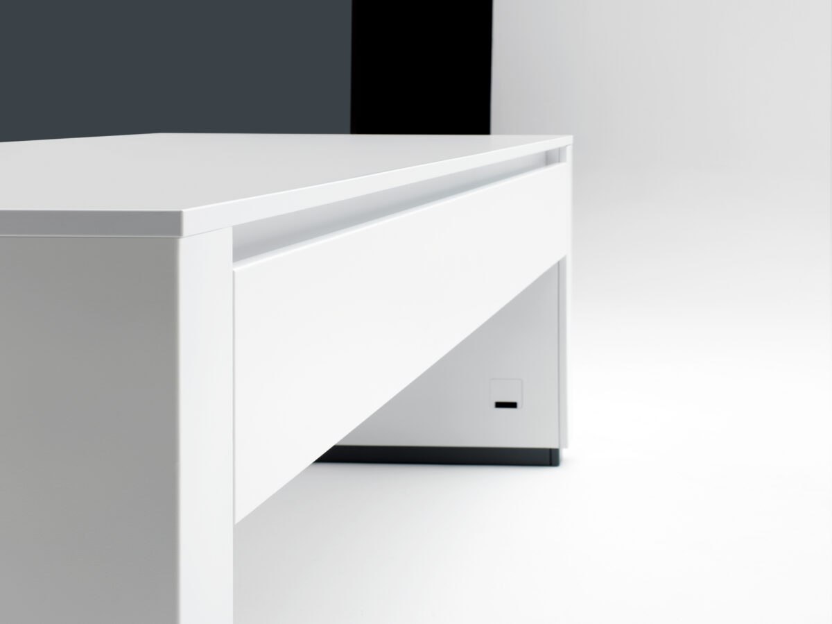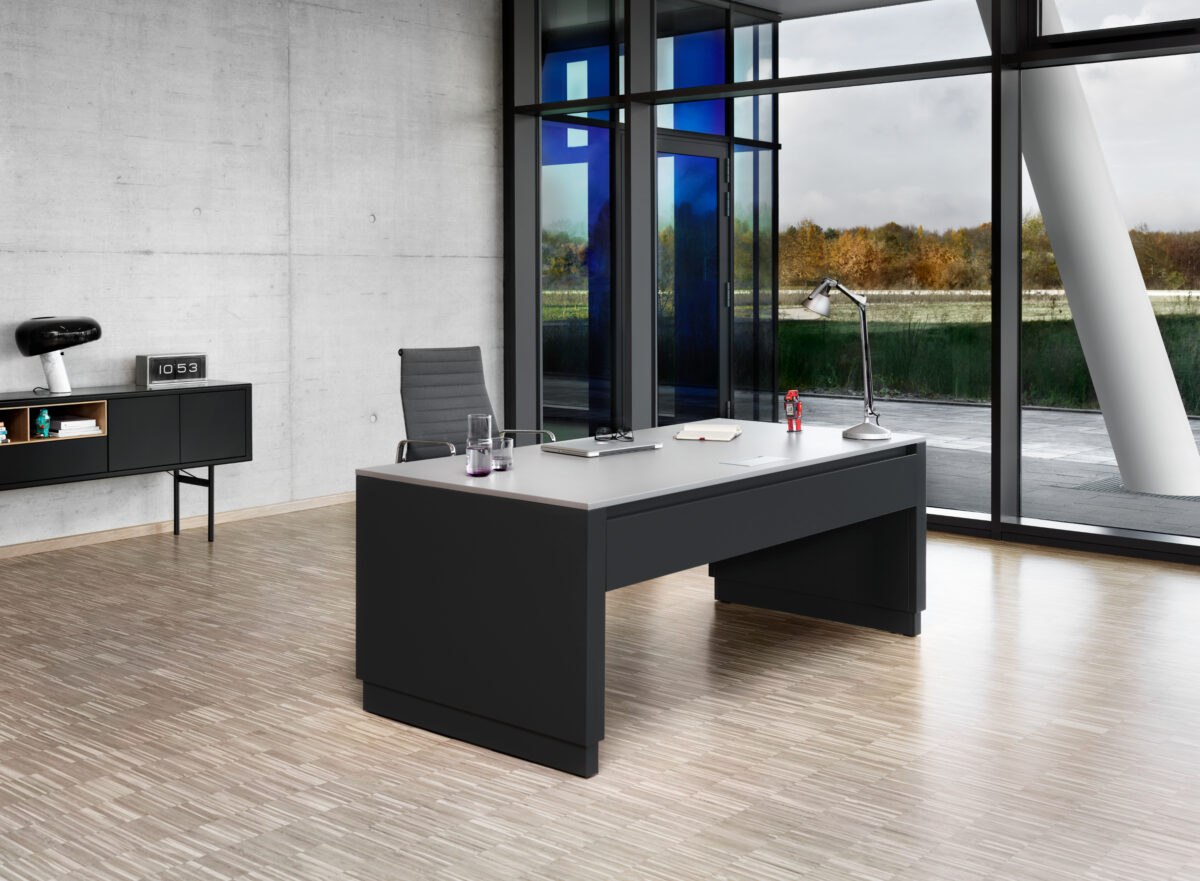 - Lackierung/RAL-Farbe: seidenmatt lackierter Stahl; RAL-Farbe passend zur Corporate Identity, auf Wunsch zweifarbig – individueller Design-Schreibtisch nach Markenauftritt