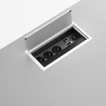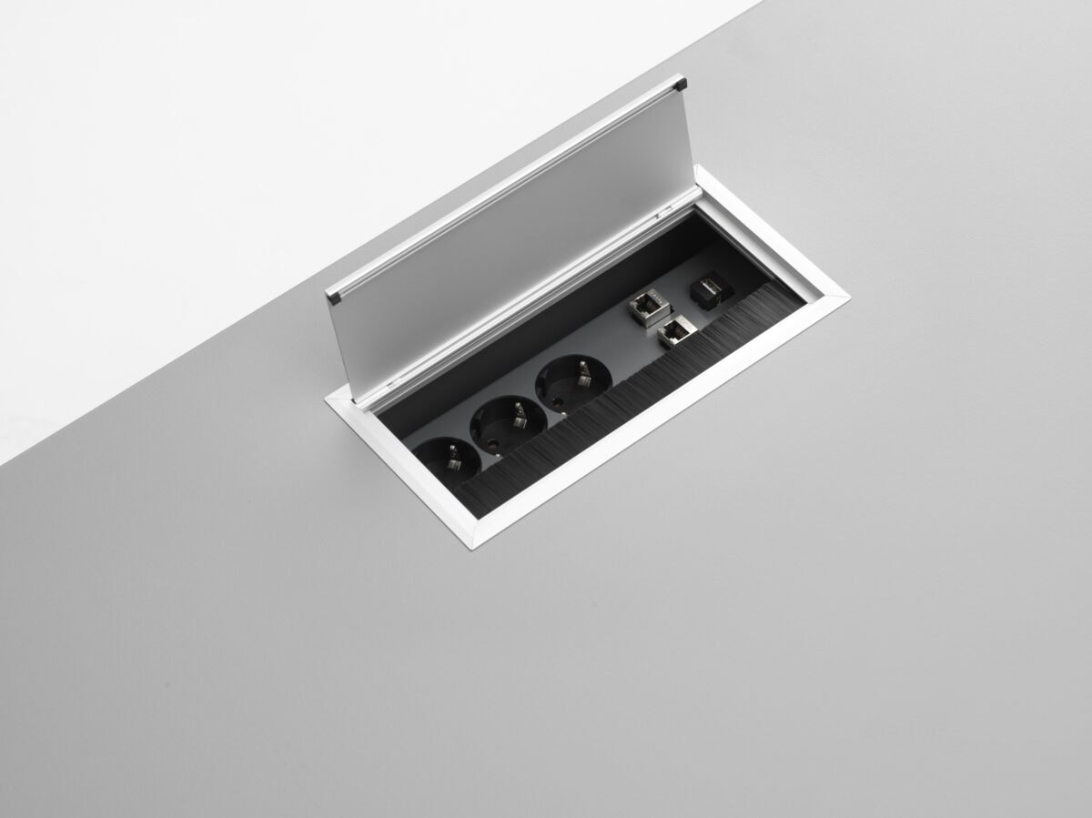 Auf Wunsch: Beinraumblende (Modesty Panel), PC-Halter, durchdachte Elektrifizierung (Steckdosen/USB). Mit passendem Rollcontainer entsteht ein durchgängiges Arbeitsplatz-System – der Workspace Schreibtisch bleibt als Sitz-Steh-Tisch klar, ergonomisch und zeitlos.