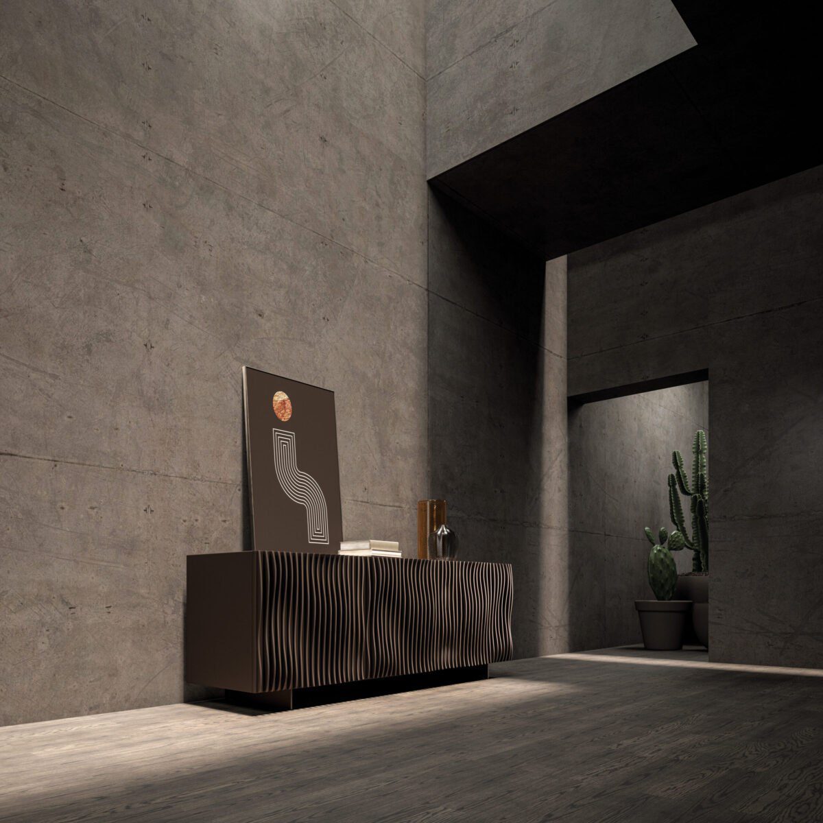 Das besondere Highlight der Onda Kommode sind die kunstvoll gestalteten Fronten aus lackiertem Holz. Unterschiedlich gearbeitete, wellenförmige Strukturen erzeugen ein spannendes Spiel aus Licht und Schatten und verleihen dem Möbel eine lebendige, fast skulpturale Wirkung. Diese geometrischen Linien sorgen für eine elegante und zugleich moderne Ausstrahlung.