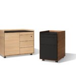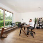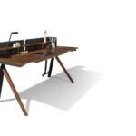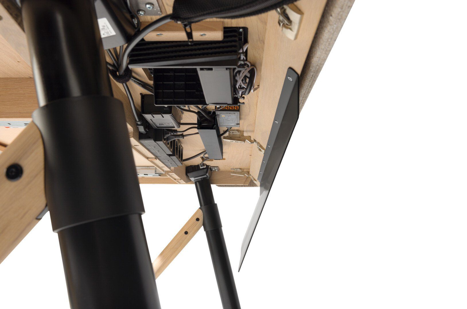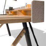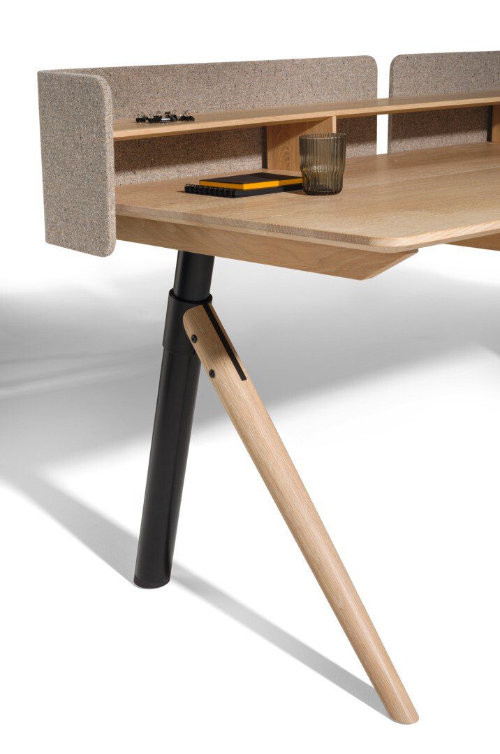 Die schräg angeordnete Hubsäule ist nicht nur ein Designelement, sondern ermöglicht eine sanfte Höhenverstellung ohne störende Bewegung nach hinten – die Schreibtischfläche fährt sogar leicht nach vorne, damit Pinnwände oder Wandbilder nicht im Weg sind. Das Ergebnis ist ein elegantes, schlankes Erscheinungsbild, das sich harmonisch in moderne Wohn- oder Arbeitsräume einfügt.