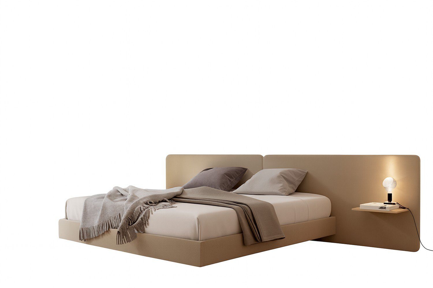 Durch ein gepolstertes Kopfteil, modulare Paneele, schwebende Ablagen und integrierbare Nachttische – vereint in einer klaren, modernen Designsprache. - Passt das Bett zu verschiedenen Schlafsystemen?