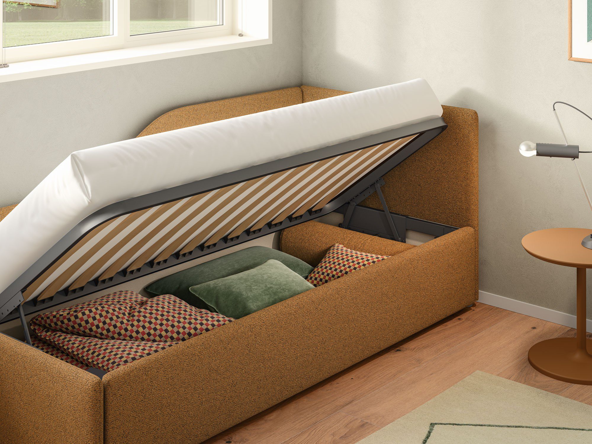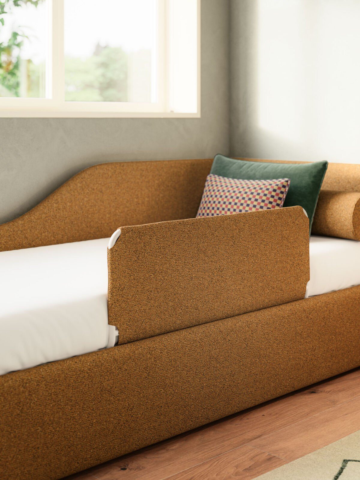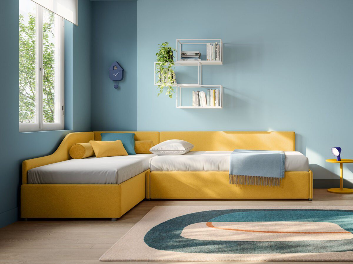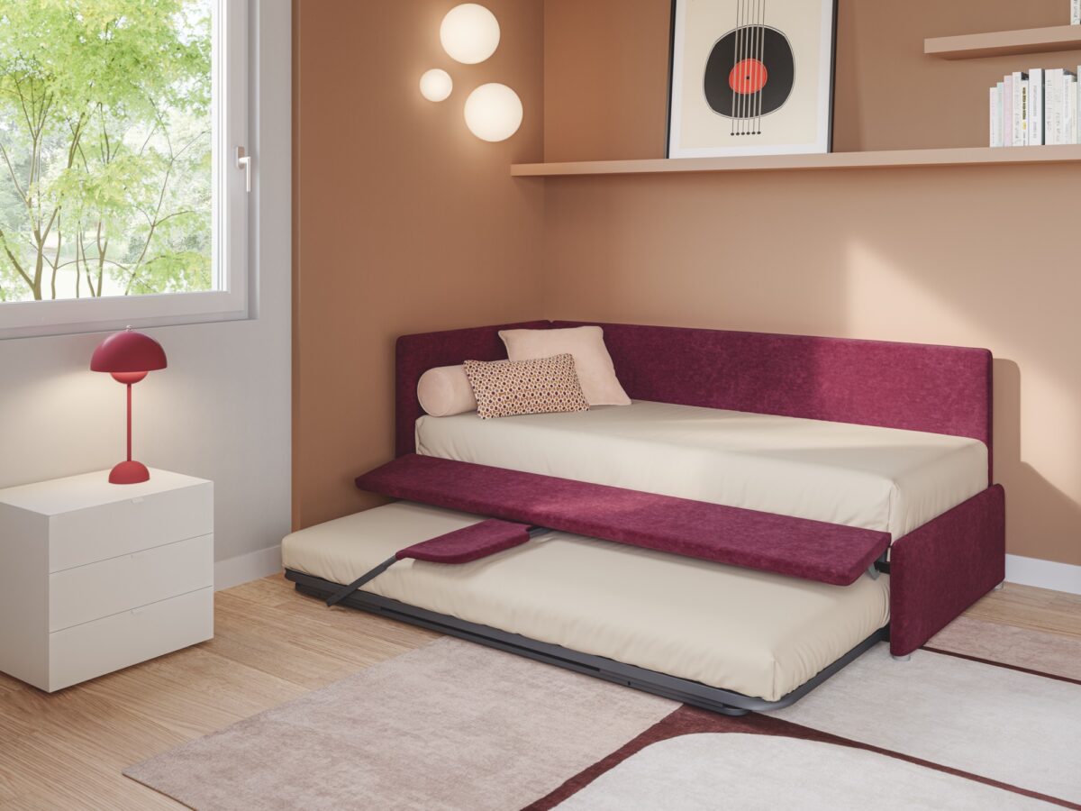 Wer sein Schlafzimmer nicht nur funktional, sondern wohnlich einrichten möchte, findet in Maya ein Bett, das optisch wie ein Polstermöbel wirkt und dadurch Wärme in den Raum bringt. Gerade in kombinierten Wohn-Schlafbereichen oder in Stadtwohnungen, in denen der Schlafbereich sichtbar ist, wirkt dieses textile Bett besonders stimmig.