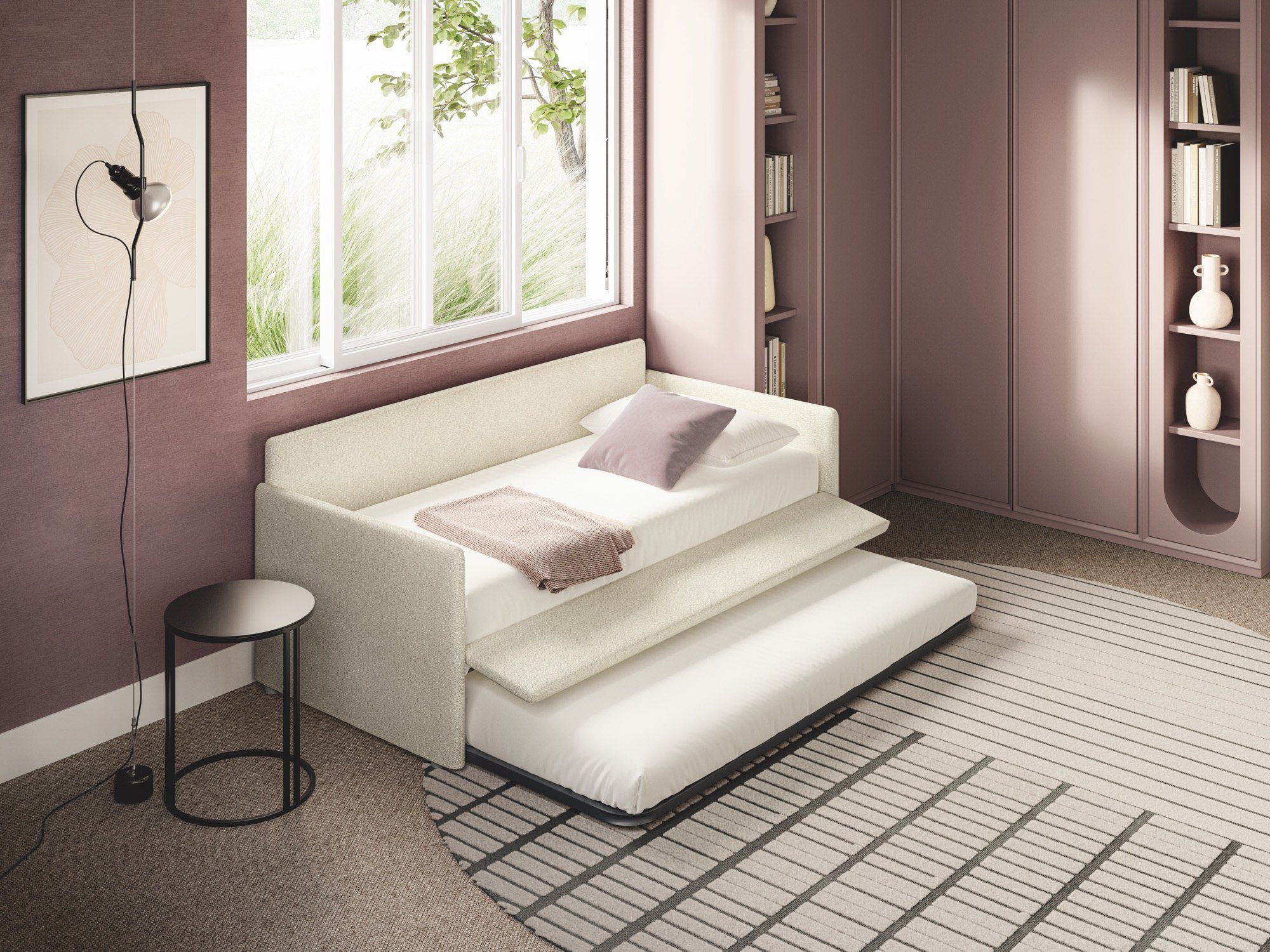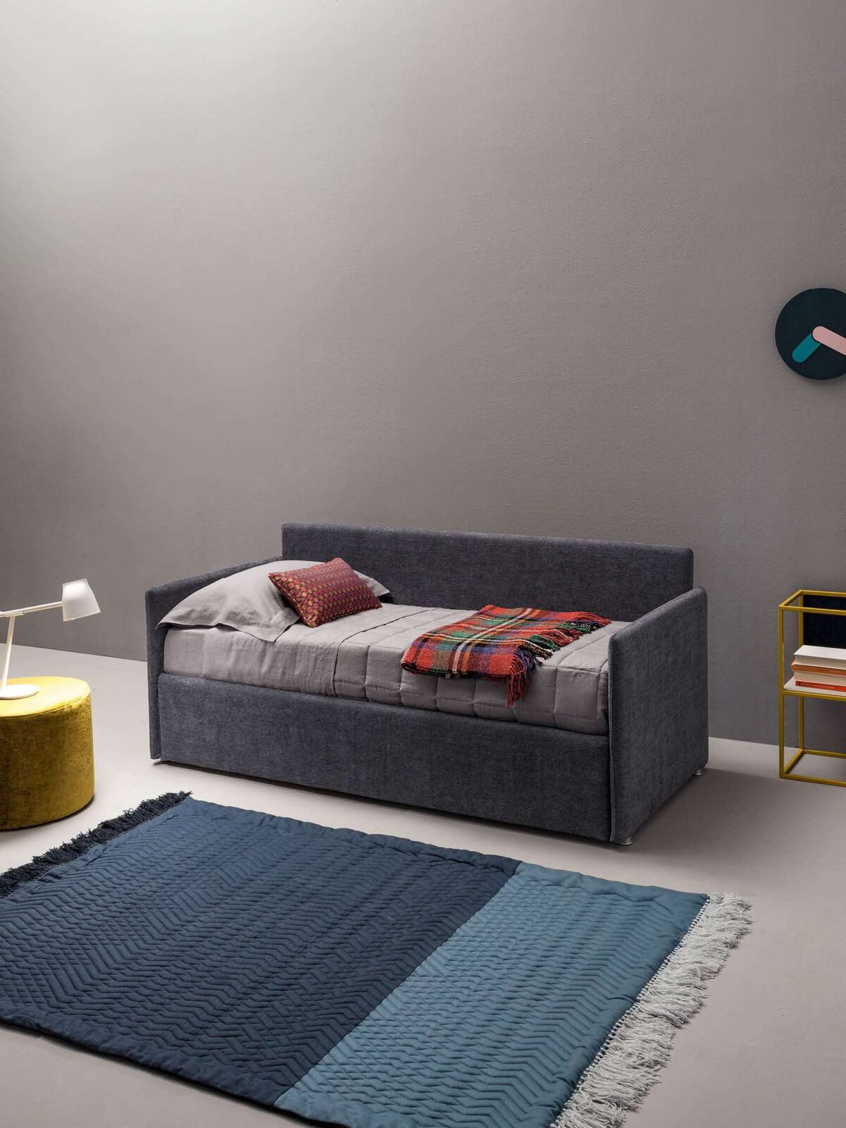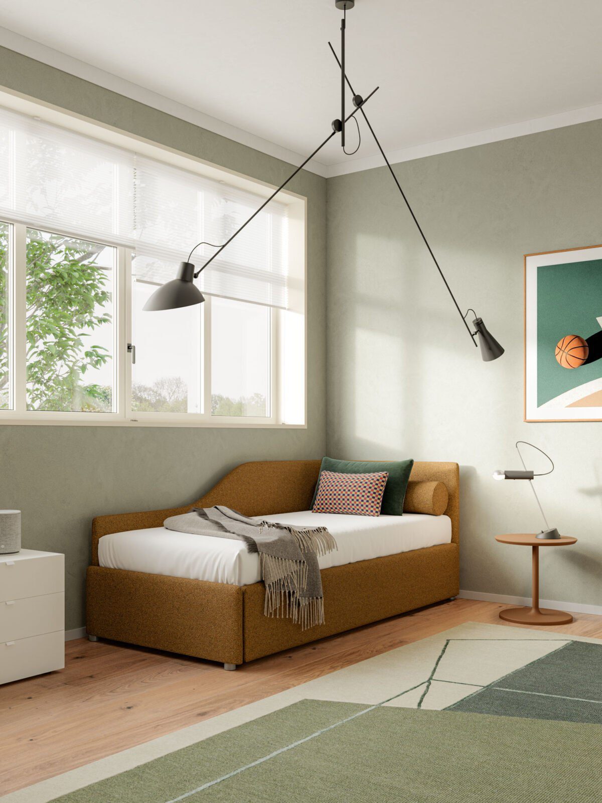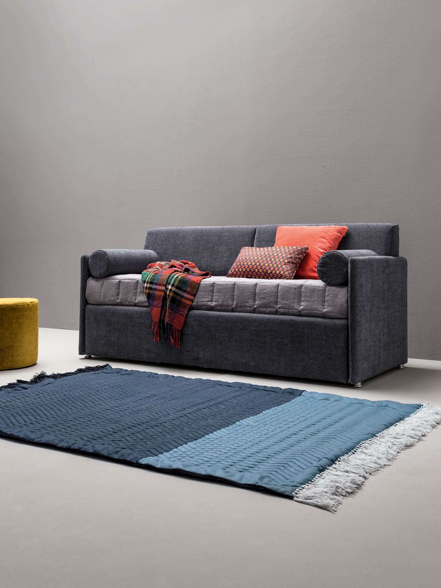 Wer sein Schlafzimmer nicht nur funktional, sondern wohnlich einrichten möchte, findet in Maya ein Bett, das optisch wie ein Polstermöbel wirkt und dadurch Wärme in den Raum bringt. Gerade in kombinierten Wohn-Schlafbereichen oder in Stadtwohnungen, in denen der Schlafbereich sichtbar ist, wirkt dieses textile Bett besonders stimmig.