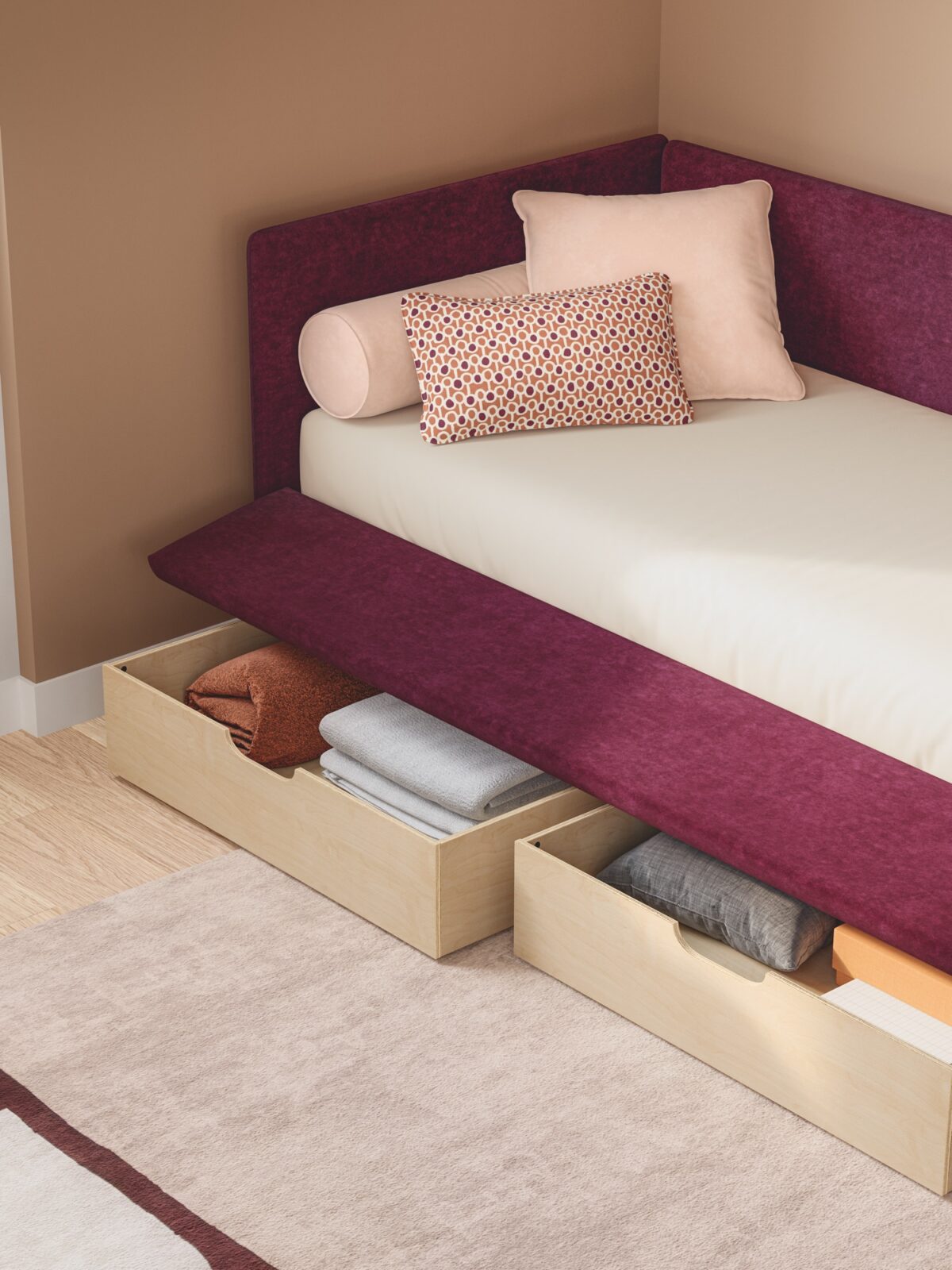 Ein großer Vorteil bei Twils: Die Bezüge sind auf Langlebigkeit und Praxis ausgerichtet. Je nach gewähltem Stoff entsteht ein völlig anderer Charakter – von feinem, glattem Stoff für ein ruhiges Schlafzimmer bis zu griffigeren, wohnlichen Qualitäten für ein gemütliches Ambiente. Die sichtbaren Nähte sind bewusst sauber geführt, sodass das Bett auch aus der Nähe wertig wirkt.