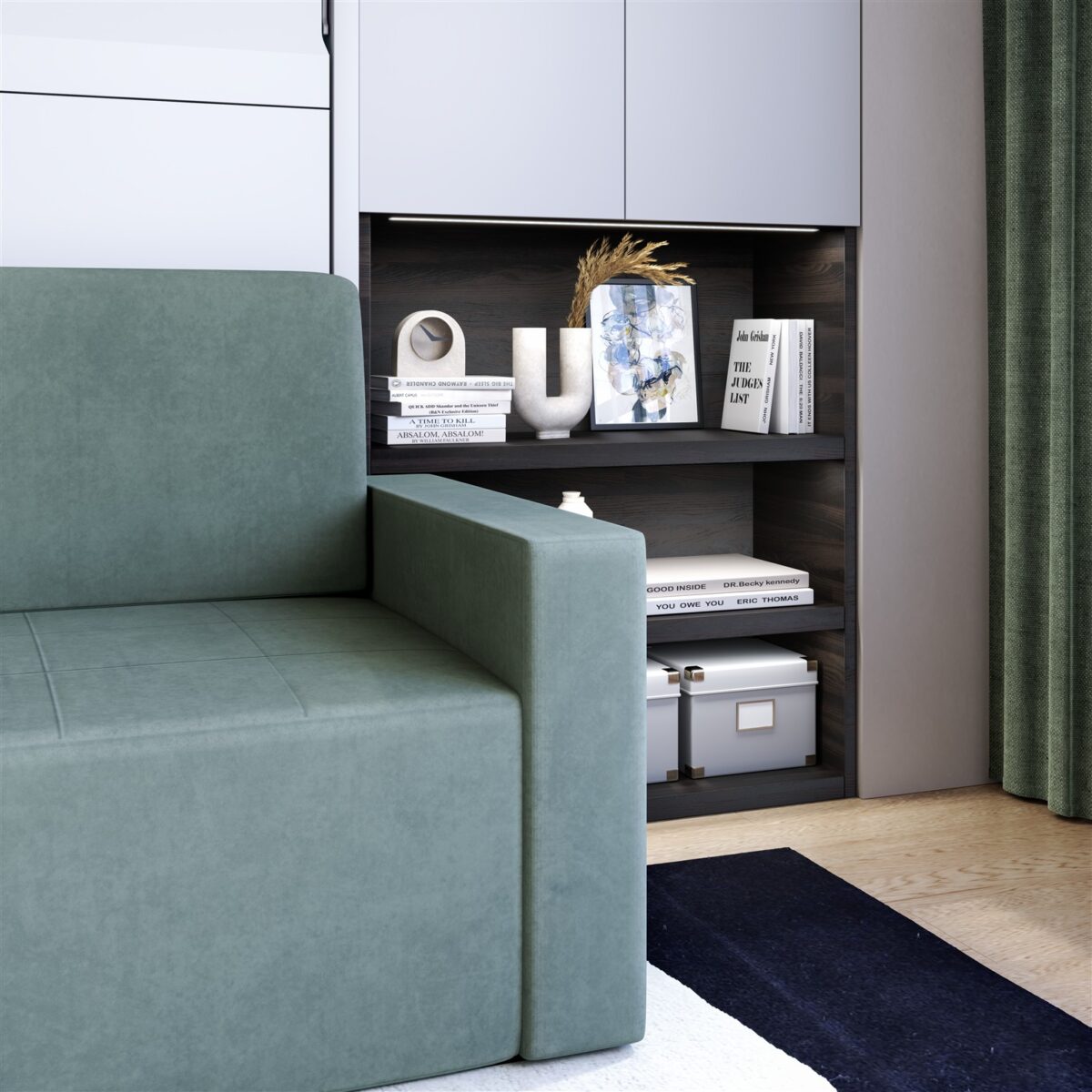 - Schrankbett/Wandbett: leichtgängiges Klappbett für schnellen Wechsel zwischen Tag- und Nachtfunktion.