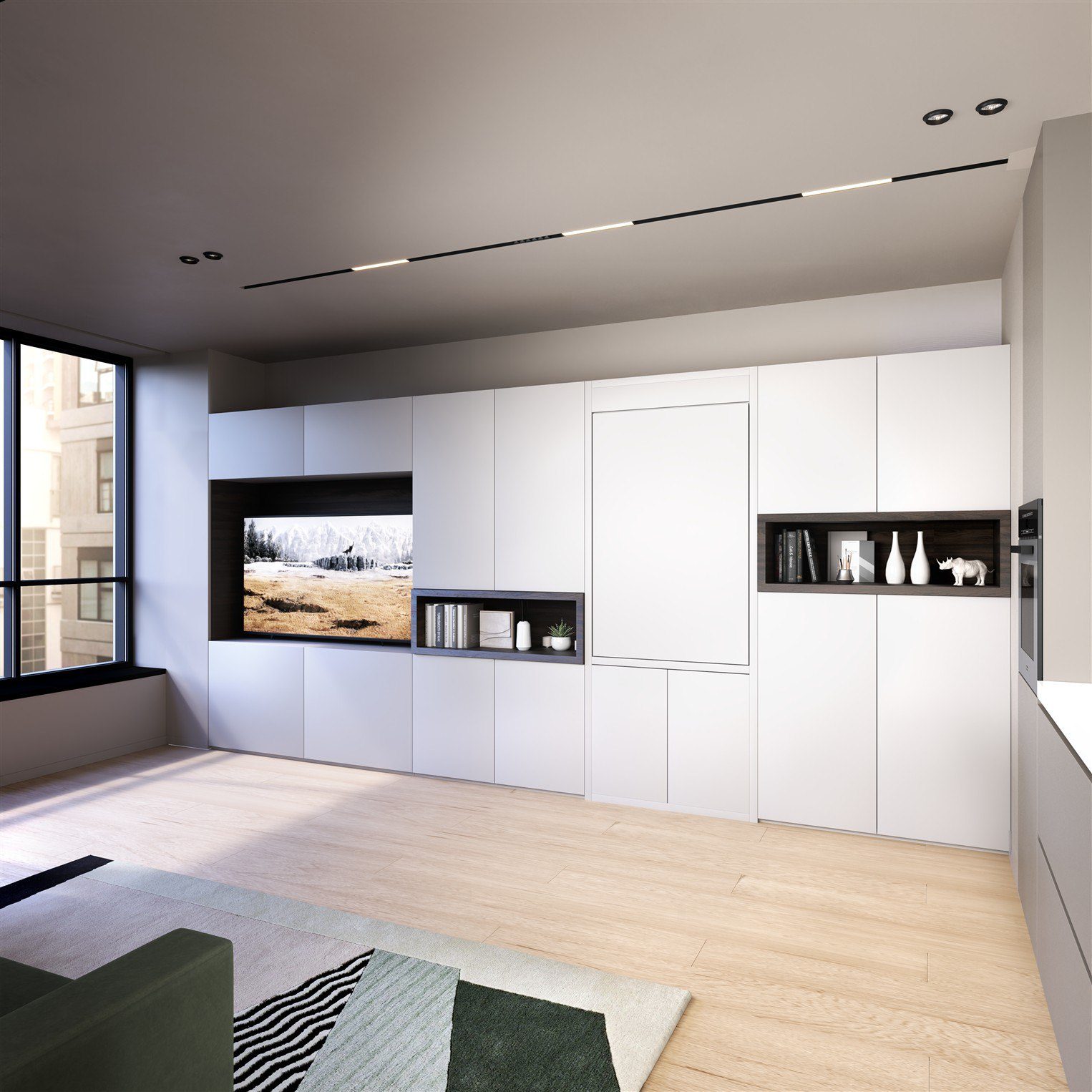 - Fronten & Korpus: Dekore und Griffbilder passend zum Interieur – modernes Schrankbett-Design.